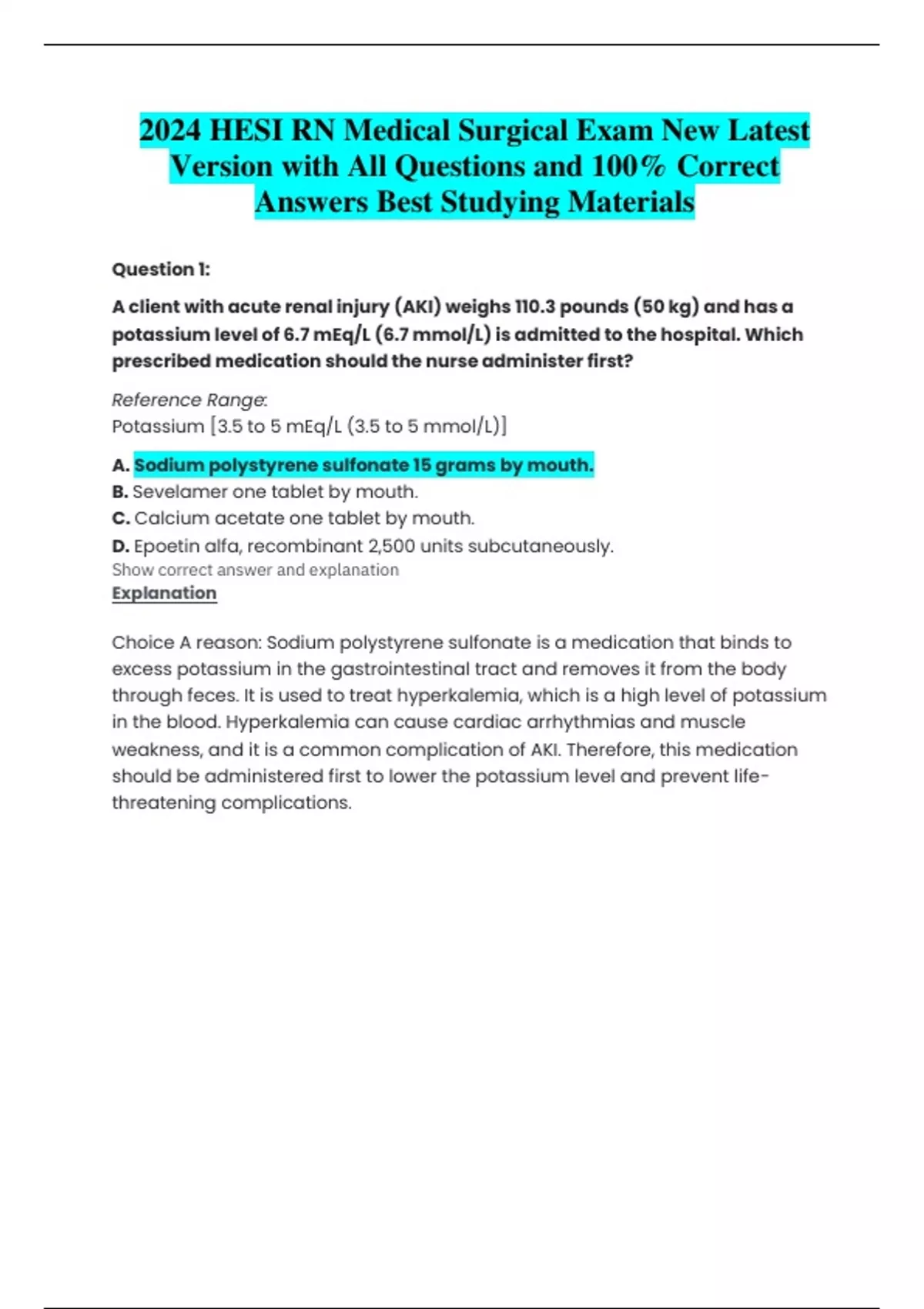 2024 HESI RN Medical Surgical Exam New Latest Version with All Questions and 100% Correct Answers Best Studying Materials