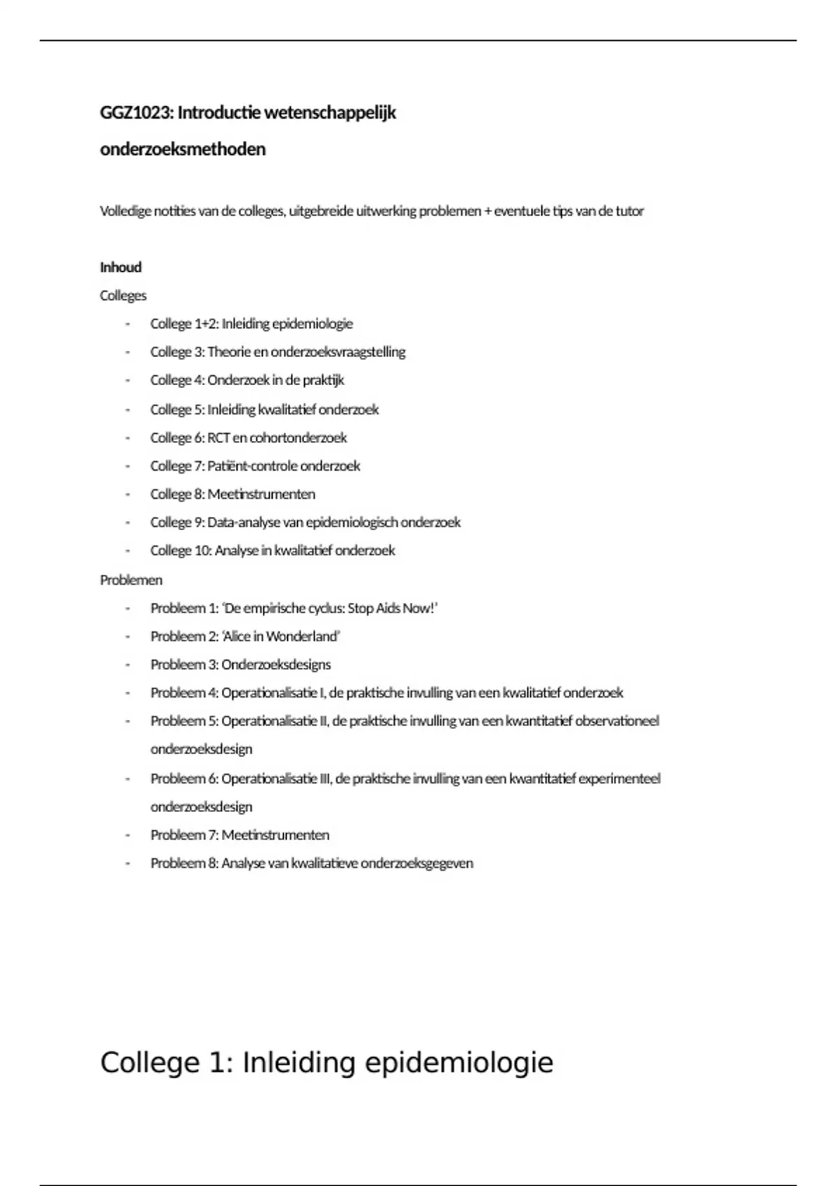 GZW1023: Introductie wetenschappelijke onderzoeksmethoden. Volledige uitwerking van de colleges en taken, plus bruikbare tips van de tutor. Met deze samenvatting in combinatie met mijn samenvatting van de training Methodologie heb ik een 8 gehaald voor het tentamen.