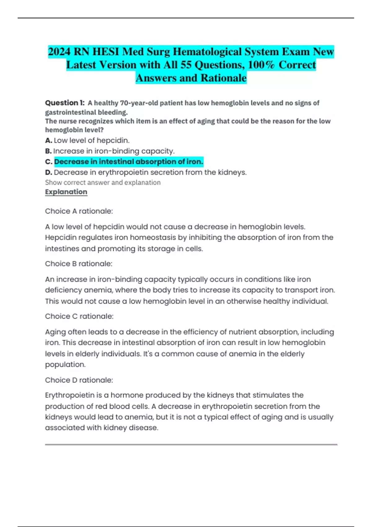 2024 RN HESI Med Surg Hematological System Exam New Latest Version with All 55 Questions, 100% Correct Answers and Rationale