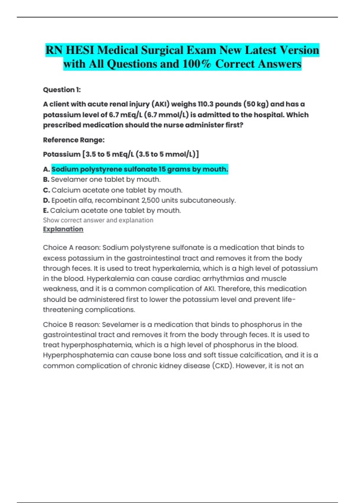 threatening complications. Choice B reason: Sevelamer is a medication that binds to phosphorus in the gastrointestinal tract and removes it from the body through feces. It is used to treat hyperphosphatemia, which is a high level of phosphorus in the blood. Hyperphosphatemia can cau se bone loss and soft tissue calcification, and it is a common complication of chronic kidney disease (CKD). However, it is not an urgent issue in AKI, and it does not affect the potassium level. Choice C reason: Calcium acetate is a medication that also binds to phosphorus in the gastrointestinal tract and removes it from the body through feces. It has the same effect and indication as sevelamer, but it also provides calcium supplementation. Howev er, it is not an urgent issue in AKI, and it does not affect the potassium level. Choice D reason: Epoetin alfa, recombinant is a medication that stimulates the production of red blood cells in the bone marrow. It is used to treat anemia, which is a low level of hemoglobin or red blood cells in the blood. Anemia can cause fatigue, weakn ess, and shortness of breath, and it is a common complication of CKD and AKI. However, it is not an urgent issue in AKI, and it does not affect the potassium level. Discussion Section Write a comment S Post Comment 0 Pulse Checks No comments Question 2: The nurse is preparing an older client for a magnetic resonance imaging (MRI) with contrast. Which laboratory value should the nurse report to the healthcare provider before the scan is performed? Reference Range: Glycosylated hemoglobin (A1C) [4% to 5.9%] Creatinine [0.5 to 1.1 mg/dL (44 to 97 umol/L)] Glucose [74 to 106 mg/dL (4.1 to 5.9 mmol/L)] Blood Urea Nitrogen (BUN) [10 to 20 mg/dL (3.6 to 7.1 mmol/L)] A. Fasting blood sugar of 200 mg/dL (11.1 mmol/L). B. Glycosylated hemoglobin A1c of 8%. C. Blood urea nitrogen of 22 mg/dL (7.9 mmol/L). D. Serum creatinine of 1.9 mg/dL (169 umol/L). Show correct answer and explanation Explanation Choice A reason: Fasting blood sugar of 200 mg/dL (11.1 mmol/L) indicates hyperglycemia, which is a high level of glucose in the blood. It can be caused by diabetes mellitus, stress, infection, or medication. Hyperglycemia can cause symptoms such as thirst , hunger, frequent urination, fatigue, and blurred vision. However, it does not affect the safety or accuracy of MRI with contrast. Choice B reason: Glycosylated hemoglobin A1c of 8% indicates poor glycemic control over the past three months. It can be caused by diabetes mellitus, chronic kidney disease, or hemoglobinopathy. Glycosylated hemoglobin A1c reflects the average blood glucos e level over the lifespan of red blood cells, which is about 120 days. However, it does not affect the safety or accuracy of MRI with contrast. Choice C reason: Blood urea nitrogen of 22 mg/dL (7.9 mmol/L) indicates mild azotemia, which is a high level of nitrogenous waste products in the blood. It can be caused by dehydration, high protein intake, gastrointestinal bleeding, or kidney impairment. Azotemia can cause symptoms such as nausea, vomiting, confusion, and lethargy. However, it does not affect the safety or accuracy of MRI with contrast. Choice D reason: Serum creatinine of 1.9 mg/dL (169 umol/L) indicates moderate renal insufficiency, which is a reduced ability of the kidneys to filter and excrete waste products and fluids from the body. It can be caused by diabetes mellitus, hypertension , glomerulonephritis, or nephrotoxic drugs. Renal insufficiency can cause symptoms such as edema, anemia, electrolyte imbalance, and acidosis. It can also increase the risk of contrast -induced nephropathy, which is a sudden deterioration of kidney function after exposure to contrast media used for imaging studies such as MRI. Contrast -induced nephropathy can lead to acute kidney injury, dialysis requirement, or even death. Therefore, serum creatinine should be reported to the healthcare provider before MRI with contrast to assess the risk and benefit of the procedure and to take preventive measures such as