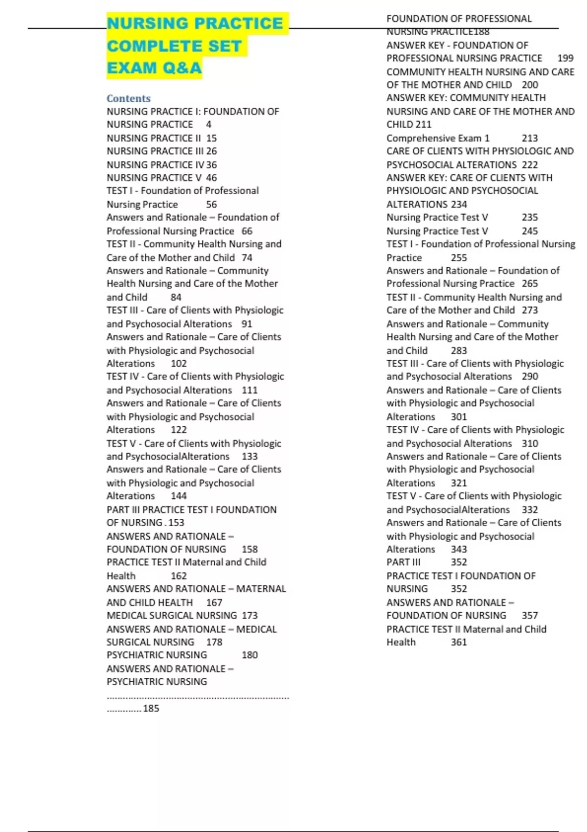 NURSING PRACTICE I: FOUNDATION OF NURSING PRACTICE SITUATION: Nursing is a profession. The nurse should have a background on the theories and foundation of nursing as it influenced what is nursing today. 1. Nursing is the protection, promotion and optimization of health and abilities, prevention of illness and injury, alleviation of suffering through the diagnosis and treatment of human response and advocacy in the care of the individuals, families, communities and the population. This is the most accepted definition of nursing as defined by the: a. PNA b. ANA c. Nightingale d. Henderson 2. Advancement in Nursing leads to the development of the Expanded Career Roles. Which of the following is NOT an expanded career role for nurses? a. Nurse practitioner b. Nurse Researcher c. Clinical nurse specialist d. Nurse anaesthesiologist 3. The Board of Nursing regulated the Nursing profession in the Philippines and is responsible for the maintenance of the quality of nursing in the country. Powers and duties of the board of nursing are the following, EXCEPT: a. Issue, suspend, revoke certificates of registration b. Issue subpoena duces tecum, ad testificandum c. Open and close colleges of nursing d. Supervise and regulate the practice of nursing 4. A nursing student or a beginning staff nurse who has not yet experienced enough real situations to make judgments about them is in what stage of Nursing Expertise? a. Novice b. Newbie c. Advanced Beginner d. Competent 5. Benner’s “Proficient” nurse level is different from the other levels in nursing expertise in the context of having: a. the ability to organize and plan activities b. having attained an advanced level of education c. a holistic understanding and perception of the client d. intuitive and analytic ability in new situations SITUATION: The nurse has been asked to administer an injection via Z TRACK technique. Questions 6 to 10 refer to this. 6. The nurse prepares an IM injection for an adult client using the Z track technique. 4 ml of medication is to be administered to the client. Which of the following site will you choose? a. Deltoid b. Rectus femoris c. Ventrogluteal d. Vastus lateralis 7. In infants 1 year old and below, which of the following is the site of choice for intramuscular Injection? a. Deltoid b. Rectus femoris c. Ventrogluteal d. Vastus lateralis 8. In order to decrease discomfort in Z track administration, which of the following is applicable? a. Pierce the skin quickly and smoothly at a 90 degree angle b. Inject the medication steadily at around 10 minutes per millilitre c. Pull back the plunger and aspirate for 1 minute to make sure that the needle did not hit a blood vessel d. Pierce the skin slowly and carefully at a 90 degree angle 9. After injection using the Z track technique, the nurse should know that she needs to wait for a few seconds before withdrawing the needle and this is to allow the medication to disperse into the muscle tissue, thus decreasing the client’s discomfort. How many seconds should the nurse wait before withdrawing the needle? a. 2 seconds 4 5 b. 5 seconds c. 10 seconds d. 15 seconds 10. The rationale in using the Z track technique in an intramuscular injection is: a. It decreases the leakage of discolouring and irritating medication into the subcutaneous tissues b. It will allow a faster absorption of the medication c. The Z track technique prevent irritation of the muscle d. It is much more convenient for the nurse