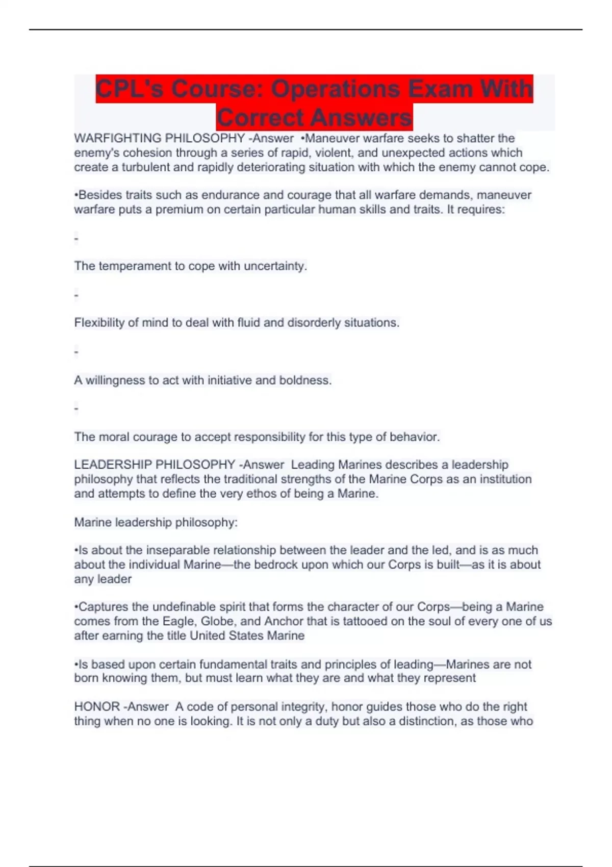 WARFIGHTING PHILOSOPHY -Answer •Maneuver warfare seeks to shatter the enemy's cohesion through a series of rapid, violent, and unexpected actions which create a turbulent and rapidly deteriorating situation with which the enemy cannot cope. •Besides traits such as endurance and courage that all warfare demands, maneuver warfare puts a premium on certain particular human skills and traits. It requires: - The temperament to cope with uncertainty. - Flexibility of mind to deal with fluid and disorderly situations. - A willingness to act with initiative and boldness. - The moral courage to accept responsibility for this type of behavior. LEADERSHIP PHILOSOPHY -Answer Leading Marines describes a leadership philosophy that reflects the traditional strengths of the Marine Corps as an institution and attempts to define the very ethos of being a Marine. Marine leadership philosophy: •Is about the inseparable relationship between the leader and the led, and is as much about the individual Marine—the bedrock upon which our Corps is built—as it is about any leader •Captures the undefinable spirit that forms the character of our Corps—being a Marine comes from the Eagle, Globe, and Anchor that is tattooed on the soul of every one of us after earning the title United States Marine •Is based upon certain fundamental traits and principles of leading—Marines are not born knowing them, but must learn what they are and what they represent HONOR -Answer A code of personal integrity, honor guides those who do the right thing when no one is looking. It is not only a duty but also a distinction, as those who possess honor are held in honor. It is found in