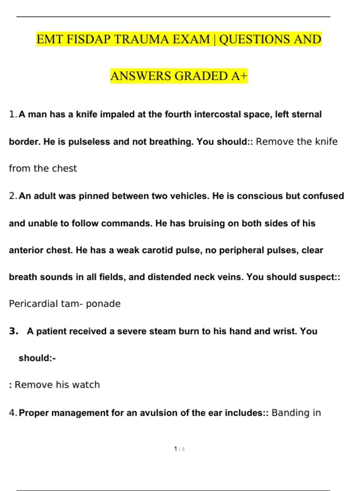 EMT FISDAP TRAUMA EXAM | QUESTIONS AND ANSWERS GRADED A+