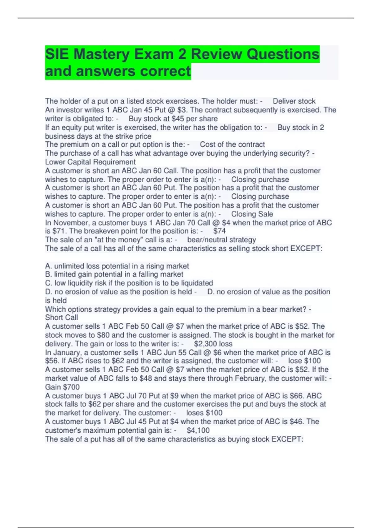SIE Mastery Exam 2 Review Questions and answers correct The holder of a put on a listed stock exercises. The holder must: - Deliver stock An investor writes 1 ABC Jan 45 Put @ $3. The contract subsequently is exercised. The writer is obligated to: - Buy stock at $45 per share If an equity put writer is exercised, the writer has the obligation to: - Buy stock in 2 business days at the strike price The premium on a call or put option is the: - Cost of the contract The purchase of a call has what advantage over buying the underlying security? - Lower Capital Requirement A customer is short an ABC Jan 60 Call. The position has a profit that the customer wishes to capture. The proper order to enter is a(n): - Closing purchase A customer is short an ABC Jan 60 Put. The position has a profit that the customer wishes to capture. The proper order to enter is a(n): - Closing purchase A customer is short an ABC Jan 60 Put. The position has a profit that the customer wishes to capture. The proper order to enter is a(n): - Closing Sale In November, a customer buys 1 ABC Jan 70 Call @ $4 when the market price of ABC is $71. The breakeven point for the position is: - $74 The sale of an "at the money" call is a: - bear/neutral strategy The sale of a call has all of the same characteristics as selling stock short EXCEPT: A. unlimited loss potential in a rising market B. limited gain potential in a falling market C. low liquidity risk if the position is to be liquidated D. no erosion of value as the position is held - D. no erosion of value as the position is held Which options strategy provides a gain equal to the premium in a bear market? - Short Call A customer sells 1 ABC Feb 50 Call @ $7 when the market price of ABC is $52. The stock moves to $80 and the customer is assigned. The stock is bought in the market for delivery. The gain or loss to the writer is: - $2,300 loss In January, a customer sells 1 ABC Jun 55 Call @ $6 when the market price of ABC is $56. If ABC rises to $62 and the writer is assigned, the customer will: - lose $100 A customer sells 1 ABC