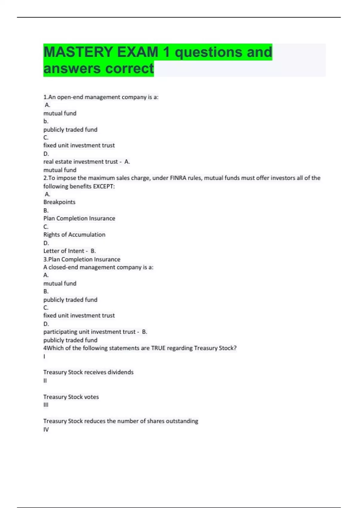 MASTERY EXAM 1 questions and answers correct 1.An open-end management company is a: A. mutual fund b. publicly traded fund C. fixed unit investment trust D. real estate investment trust - A. mutual fund 2.To impose the maximum sales charge, under FINRA rules, mutual funds must offer investors all of the following benefits EXCEPT: A. Breakpoints B. Plan Completion Insurance C. Rights of Accumulation D. Letter of Intent - B. 3.Plan Completion Insurance A closed-end management company is a: A. mutual fund B. publicly traded fund C. fixed unit investment trust D. participating unit investment trust - B. publicly traded fund 4Which of the following statements are TRUE regarding Treasury Stock? I Treasury Stock receives dividends II Treasury Stock vot