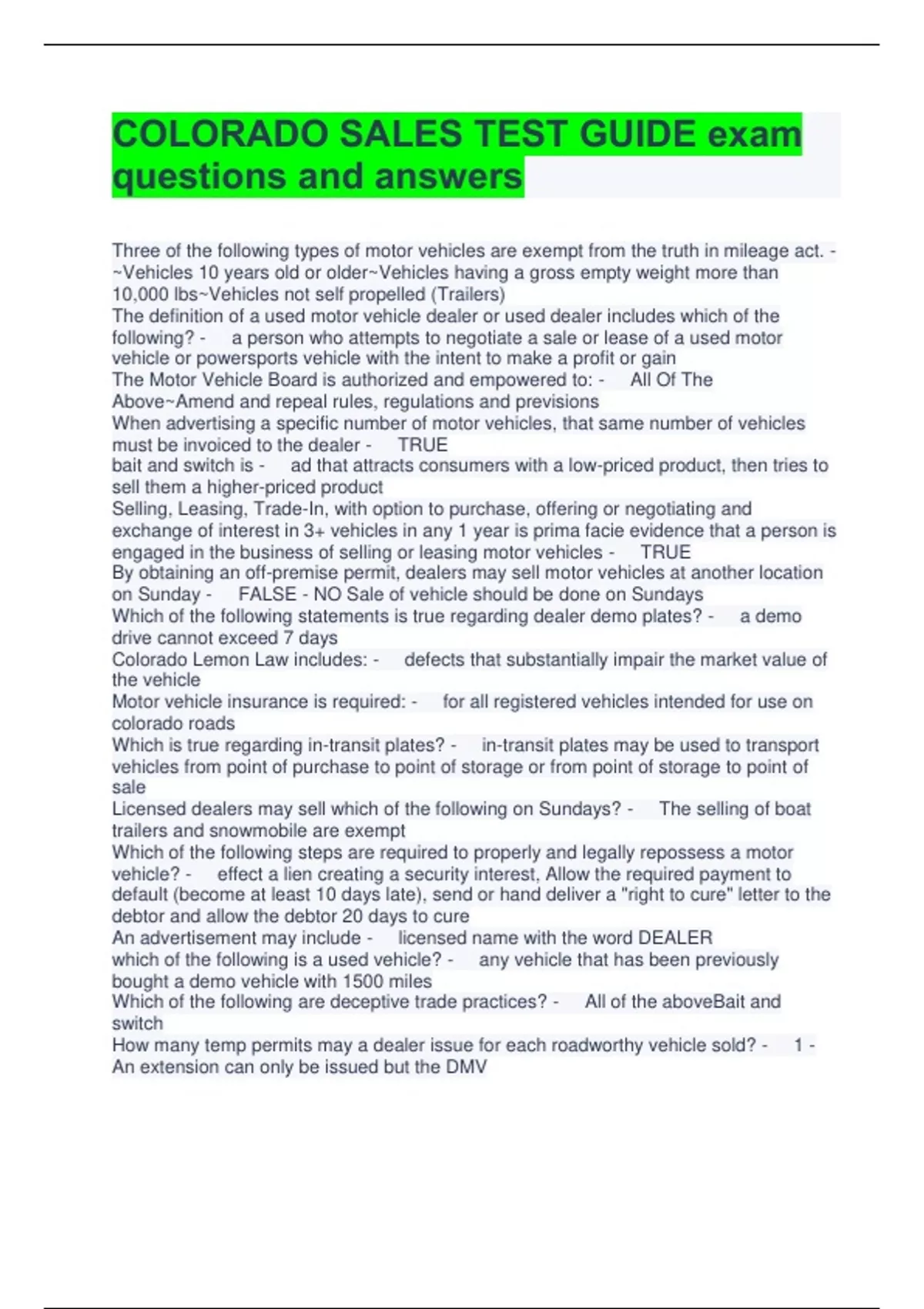 COLORADO SALES TEST GUIDE exam questions and answers Three of the following types of motor vehicles are exempt from the truth in mileage act. - ~Vehicles 10 years old or older~Vehicles having a gross empty weight more than 10,000 lbs~Vehicles not self propelled (Trailers) The definition of a used motor vehicle dealer or used dealer includes which of the following? - a person who attempts to negotiate a sale or lease of a used motor vehicle or powersports vehicle with the intent to make a profit or gain The Motor Vehicle Board is authorized and empowered to: - All Of The Above~Amend and repeal rules, regulations and previsions When advertising a specific number of motor vehicles, that same number of vehicles must be invoiced to the dealer - TRUE bait and switch is - ad that attracts consumers with a low-priced product, then tries to sell them a higher-priced product Selling, Leasing, Trade-In, with option to purchase, offering or negotiating and exchange of interest in 3+ vehicles in any 1 year is prima facie evidence that a person is engaged in the business of selling or leasing motor vehicles - TRUE By obtaining an off-premise permit, dealers may sell motor vehicles at another location on Sunday - FALSE - NO Sale of vehicle should be done on Sundays Which of the following statements is true regarding dealer demo plates? - a demo drive cannot exceed 7 days Colorado Lemon Law includes: - defects that substantially impair the market value of the vehicle Motor vehicle insurance is required: - for all registered vehicles intended for use on colorado roads Which is true regarding in-transit plates? - in-transit plates may be used to transport vehicles from point of purchase to point of storage or from point of storage to point of sale Licensed dealers may sell which of the following on Sundays? - The selling of boat trailers and snowmobile are exempt Which of the following steps are required to properly and legally repossess a motor vehicle? - effect a