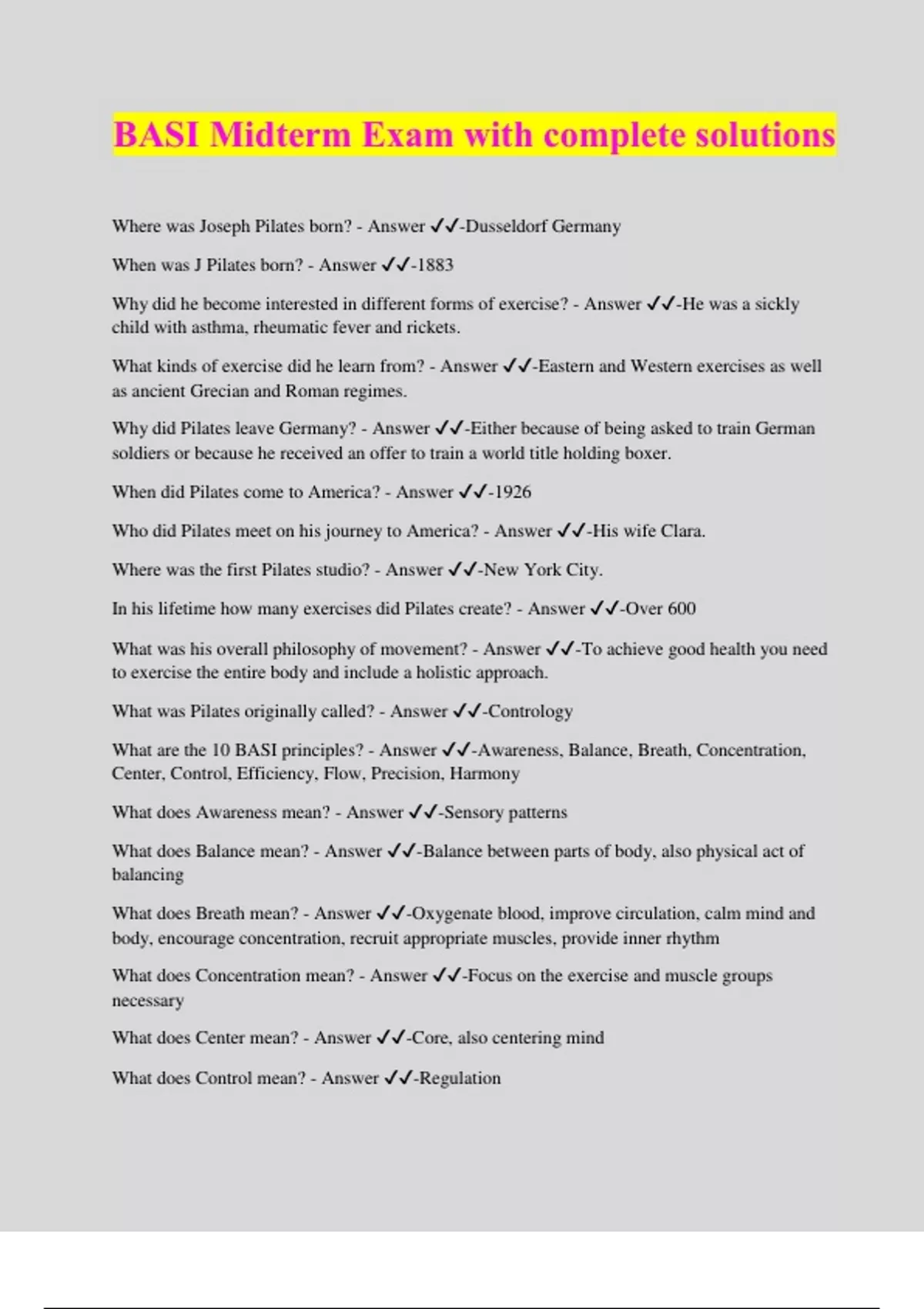 BASI Midterm Exam with complete solutions Where was Joseph Pilates born? - Answer ️️ -Dusseldorf Germany When was J Pilates born? - Answer ️️ -1883 Why did he become interested in different forms of exercise? - Answer ️️ -He was a sickly child with asthma, rheumatic fever and rickets. What kinds of exercise did he learn from? - Answer ️️ -Eastern and Western exercises as well as ancient Grecian and Roman regimes. Why did Pilates leave Germany? - Answer ️️ -Either because of being asked to train German soldiers or because he received an offer to train a world title holding boxer. When did Pilates come to America? - Answer ️️ -1926 Who did Pilates meet on his journey to America? - Answer ️️ -His wife Clara. Where was the first Pilates studio? - Answer ️️ -New York City. In his lifetime how many exercises did Pilates create? - Answer ️️ -Over 600 What was his overall philosophy of movement? - Answer ️️ -To achieve good health you need to exercise the entire body and include a holistic approach. What was Pilates originally called? - Answer ️️ -Contrology What are the 10 BASI principles? - Answer ️️ -Awareness, Balance, Breath, Concentration, Center, Control, Efficiency, Flow, Precision, Harmony What does Awareness mean? - Answer ️️ -Sensory patterns What does Balance mean? - Answer ️️ -Balance between parts of body, also physical act of balancing What does Breath mean? - Answer ️️ -Oxygenate blood, improve circulation, calm mind and body, encourage concentration, recruit appropriate muscles, provide inner rhythm What does Concentration mean? - Answer ️️ -Focus on the exercise and muscle groups necessary What does Center mean? - Answer ️️ -Core, also centering mind What does Control mean? - Answer ️️ -Regulation