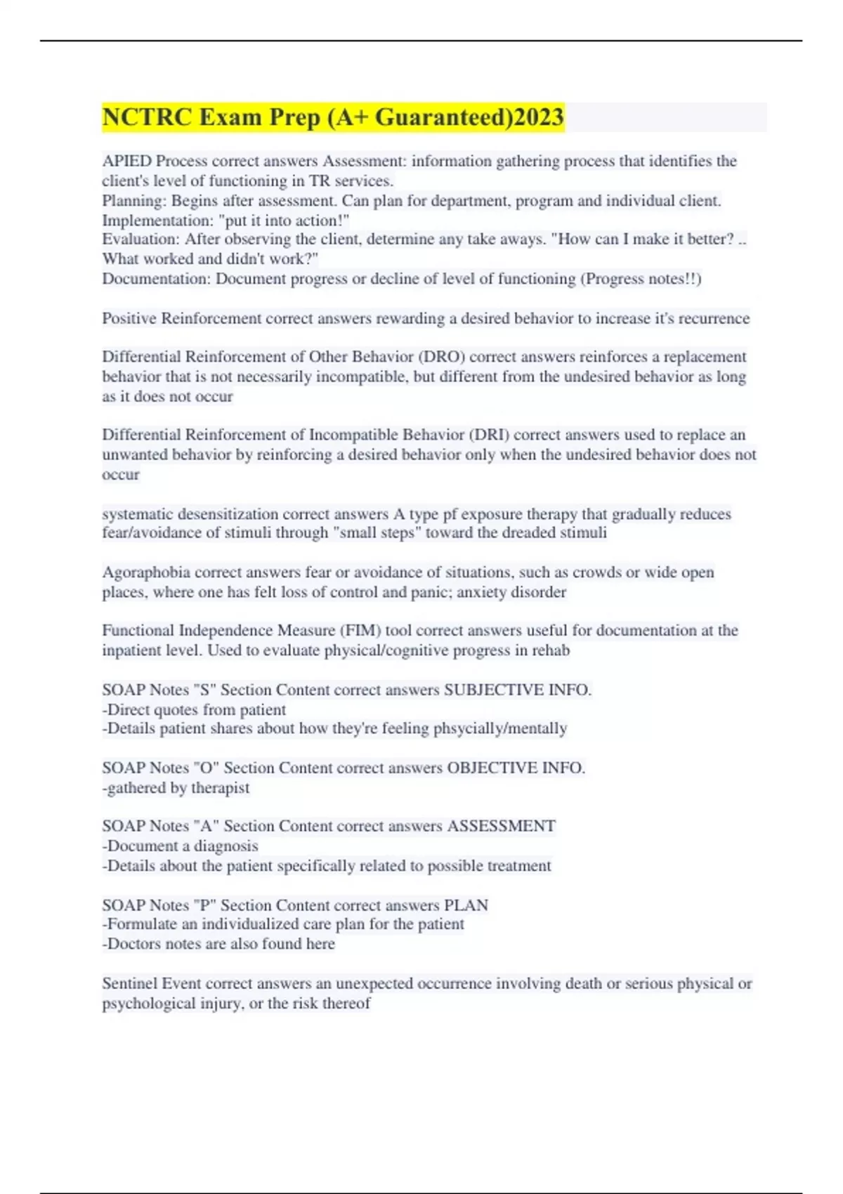 APIED Process correct answers Assessment: information gathering process that identifies the client's level of functioning in TR services. Planning: Begins after assessment. Can plan for department, program and individual client. Implementation: "put it into action!" Evaluation: After observing the client, determine any take aways. "How can I make it better? .. What worked and didn't work?" Documentation: Document progress or decline of level of functioning (Progress notes!!) Positive Reinforcement correct answers rewarding a desired behavior to increase it's recurrence Differential Reinforcement of Other Behavior (DRO) correct answers reinforces a replacement behavior that is not necessarily incompatible, but different from the undesired behavior as long as it does not occur Differential Reinforcement of Incompatible Behavior (DRI) correct answers used to replace an unwanted behavior by reinforcing a desired behavior only when the undesired behavior does not occur systematic desensitization correct answers A type pf exposure therapy that gradually reduces fear/avoidance of stimuli through "small steps" toward the dreaded stimuli Agoraphobia correct answers fear or avoidance of situations, such as crowds or wide open places, where one has felt loss of control and panic; anxiety disorder Functional Independence Measure (FIM) tool correct answers useful for documentation at the inpatient level. Used to evaluate physical/cognitive progress in rehab SOAP Notes "S" Section Content correct answers SUBJECTIVE INFO. -Direct quotes from patient -Details patient shares about how they're feeling phsycially/mentally SOAP Notes "O" Section Content correct answers OBJECTIVE INFO. -gathered by therapist SOAP Notes "A" Section Content correct answers ASSESSMENT -Document a diagnosis -Details about the patient specifically related to possible treatment SOAP Notes "P" Section Content correct answers PLAN -Formulate an individualized care plan for the patient -Doctors notes are also found here Sentinel Event correct answers an unexpected occurrence involving death or serious physical or psychological injury, or the risk thereofContent Validity correct answers The degree to which the content of a test is representative of the domain it's supposed to cover. Conccurent validity correct answers the extent that a test's scores correlate with the scores on another, similar, established test when both are given at