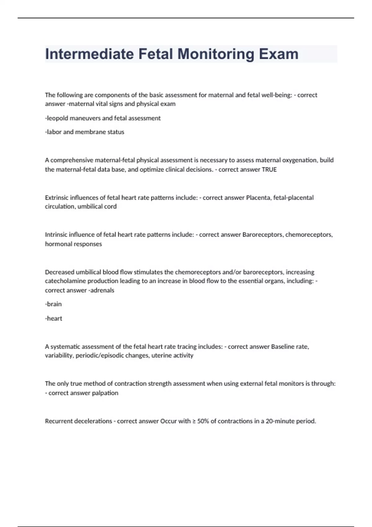 Intermediate Fetal Monitoring Exam The following are components of the basic assessment for maternal and fetal well-being: - correct answer -maternal vital signs and physical exam -leopold maneuvers and fetal assessment -labor and membrane status A comprehensive maternal-fetal physical assessment is necessary to assess maternal oxygenation, build the maternal-fetal data base, and optimize clinical decisions. - correct answer TRUE Extrinsic influences of fetal heart rate patterns include: - correct answer Placenta, fetal-placental circulation, umbilical cord Intrinsic influence of fetal heart rate patterns include: - correct answer Baroreceptors, chemoreceptors, hormonal responses Decreased umbilical blood flow stimulates the chemoreceptors and/or baroreceptors, increasing catecholamine production leading to an increase in blood flow to the essential organs, including: - correct answer -adrenals -brain -heart A systematic assessment of the fetal heart rate tracing includes: - correct answer Baseline rate, variability, periodic/episodic changes, uterine activity The only true method of contraction strength assessment when using external fetal monitors is through: - correct answer palpation