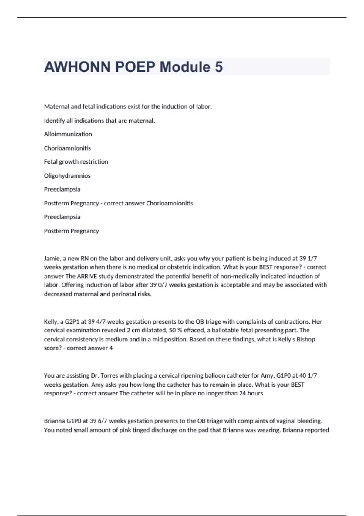 AWHONN POEP Module 5Maternal and fetal indications exist for the induction of labor. Identify all indications that are maternal. Alloimmunization Chorioamnionitis Fetal growth restriction Oligohydramnios Preeclampsia Postterm Pregnancy - correct answer Chorioamnionitis Preeclampsia Postterm Pregnancy Jamie, a new RN on the labor and delivery unit, asks you why your patient is being induced at 39 1/7 weeks gestation when there is no medical or obstetric indication. What is your BEST response? - correct answer The ARRIVE study demonstrated the potential benefit of non-medically indicated induction of labor. Offering induction of labor after 39 0/7 weeks gestation is acceptable and may be associated with decreased maternal and perinatal risks. Kelly, a G2P1 at 39 4/7 weeks gestation presents to the OB triage with complaints of contractions. Her cervical examination revealed 2 cm dilatated, 50 % effaced, a ballotable fetal presenting part. The cervical consistency is medium and in a mid position. Based on these findings, what is Kelly's Bishop score? - correct answer 4 You are assisting Dr. Torres with placing a cervical ripening balloon catheter for Amy, G1P0 at 40 1/7 weeks gestation. Amy asks you how long the catheter has to remain in place. What is your BEST response? - correct answer The catheter will be in place no longer than 24 hours Brianna G1P0 at 39 6/7 weeks gestation presents to the OB triage with complaints of vaginal bleeding. You noted small amount of pink tinged discharge on the pad that Brianna was wearing. Brianna reported