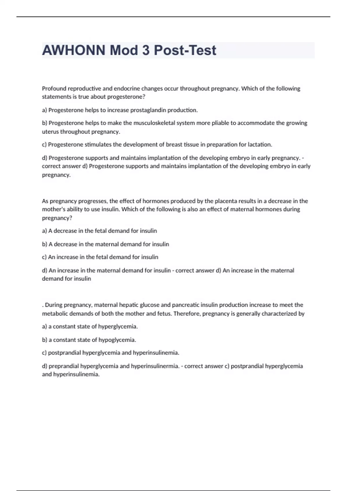 AWHONN Mod 3 Post-Test Profound reproductive and endocrine changes occur throughout pregnancy. Which of the following statements is true about progesterone? a) Progesterone helps to increase prostaglandin production. b) Progesterone helps to make the musculoskeletal system more pliable to accommodate the growing uterus throughout pregnancy. c) Progesterone stimulates the development of breast tissue in preparation for lactation. d) Progesterone supports and maintains implantation of the developing embryo in early pregnancy. - correct answer d) Progesterone supports and maintains implantation of the developing embryo in early pregnancy. As pregnancy progresses, the effect of hormones produced by the placenta results in a decrease in the mother's ability to use insulin. Which of the following is also an effect of maternal hormones during pregnancy? a) A decrease in the fetal demand for insulin b) A decrease in the maternal demand for insulin c) An increase in the fetal demand for insulin d) An increase in the maternal demand for insulin - correct answer d) An increase in the maternal demand for insulin . During pregnancy, maternal hepatic glucose and pancreatic insulin production increase to meet the metabolic demands of both the mother and fetus. Therefore, pregnancy is generally characterized by a) a constant state of hyperglycemia. b) a constant state of hypoglycemia. c) postprandial hyperglycemia and hyperinsulinemia. d) preprandial hyperglycemia and hyperinsulinermia. - correct answer c) postprandial hyperglycemia and hyperinsulinemia. Mrs. Mavis is 38 weeks pregnant and presents to the outpatient testing unit for a nonstress test. A reactive nonstress test for a fetus at this gestational age includes two fetal heart rate increases of 15 beats per minute above the baseline lasting for 15 seconds or longer in a timeframe of a) 10 minutes. b) 20 minutes. c) 30 minutes. d) 40 minutes. - correct answer b) 20 minutes. If a mother is Rh-negative and her fetus is Rh-positive, the mother will create antibodies against the fetal cells anytime they cross the placenta. To prevent Rh isoimmunization, Rh-negative mothers are screened with a D (Rh) antibody screen and given D immune globulin (RhIG) as prophylaxis at which gestational age? a) 24 weeks b) 28 weeks c) 32 weeks d) 36 weeks - correct answer b) 28 weeks Which of the following coagulation factors does not increase during pregnancy? a) Factor VII b) Fibrin c) Fibrinogen d) Platelets - correct answer d) Platelets