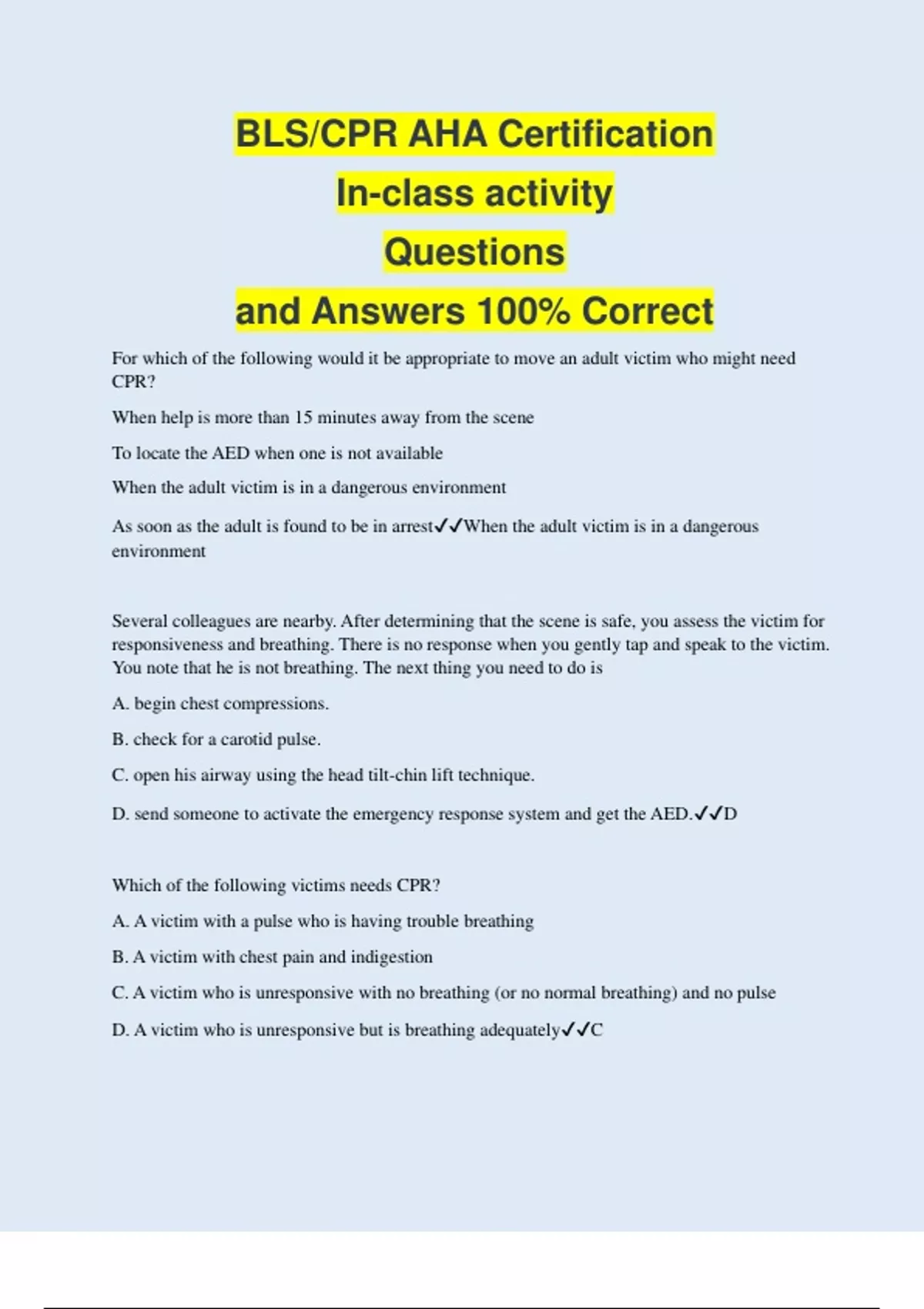 BLS/CPR AHA Certification In-class activity Questions and Answers 100% Correct
