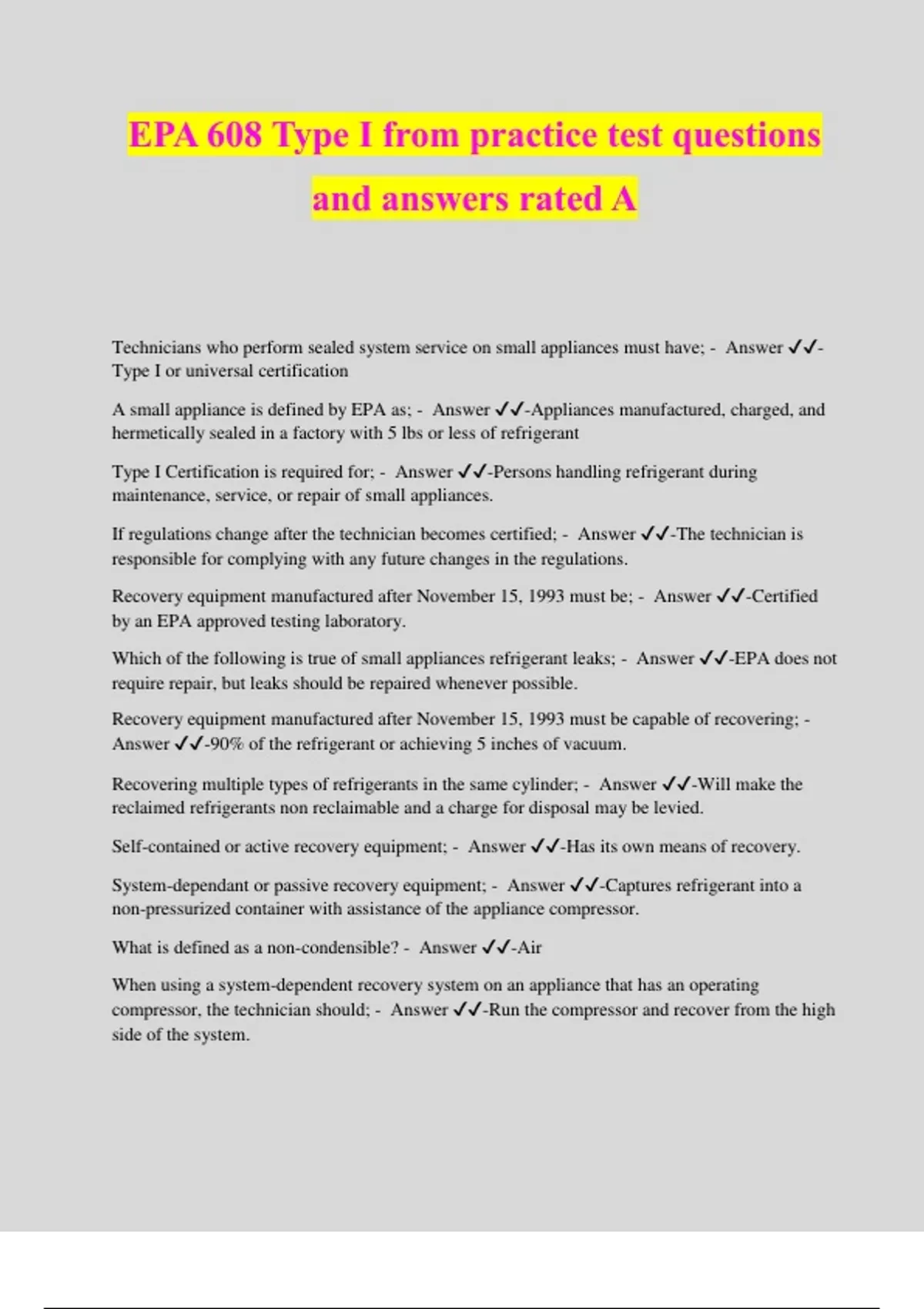 EPA 608 Type I from practice test questions and answers rated A Technicians who perform sealed system service on small appliances must have; - Answer ️️ - Type I or universal certification A small appliance is defined by EPA as; - Answer ️️ -Appliances manufactured, charged, and hermetically sealed in a factory with 5 lbs or less of refrigerant Type I Certification is required for; - Answer ️️ -Persons handling refrigerant during maintenance, service, or repair of small appliances. If regulations change after the technician becomes certified; - Answer ️️ -The technician is responsible for complying with any future changes in the regulations. Recovery equipment manufactured after November 15, 1993 must be; - Answer ️️ -Certified by an EPA approved testing laboratory. Which of the following is true of small appliances refrigerant leaks; - Answer ️️ -EPA does not require repair, but leaks should be repaired whenever possible. Recovery equipment manufactured after November 15, 1993 must be capable of recovering; - Answer ️️ -90% of the refrigerant or achieving 5 inches of vacuum. Recovering multiple types of refrigerants in the same cylinder; - Answer ️️ -Will make the reclaimed refrigerants non reclaimable and a charge for disposal may be levied. Self-contained or active recovery equipment; - Answer ️️ -Has its own means of recovery