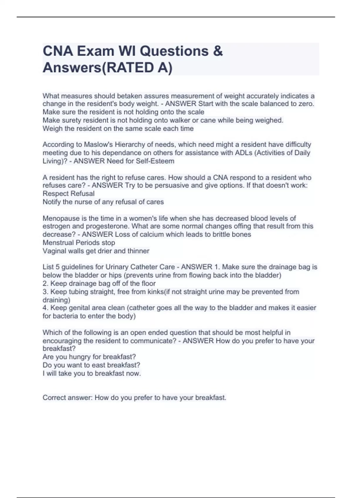 What measures should betaken assures measurement of weight accurately indicates a change in the resident's body weight. - ANSWER Start with the scale balanced to zero. Make sure the resident is not holding onto the scale Make surety resident is not holding onto walker or cane while being weighed. Weigh the resident on the same scale each time According to Maslow's Hierarchy of needs, which need might a resident have difficulty meeting due to his dependance on others for assistance with ADLs (Activities of Daily Living)? - ANSWER Need for Self-Esteem A resident has the right to refuse cares. How should a CNA respond to a resident who refuses care? - ANSWER Try to be persuasive and give options. If that doesn't work: Respect Refusal Notify the nurse of any refusal of cares Menopause is the time in a women's life when she has decreased blood levels of estrogen and progesterone. What are some normal changes offing that result from this decrease? - ANSWER Loss of calcium which leads to brittle bones Menstrual Periods stop Vaginal walls get drier and thinner List 5 guidelines for Urinary Catheter Care - ANSWER 1. Make sure the drainage bag is below the bladder or hips (prevents urine from flowing back into the bladder) 2. Keep drainage bag off of the floor 3. Keep tubing straight, free from kinks(if not straight urine may be prevented from draining) 4. Keep genital area clean (catheter goes all the way to the bladder and makes it easier for bacteria to enter the body) Which of the following is an open ended question that should be most helpful in encouraging the resident to communicate? - ANSWER How do you prefer to have your breakfast? Are you hungry for breakfast? Do you want to east breakfast? I will take you to breakfast now. Correct answer: How do you prefer to have your breakfast. List tasks which are typically not in the scope of practice for CNAs? - ANSWER Administering Medication Procedures requiring sterile technique Diagnosing illness or prescribing treatments or meds Informing residents or family of diagnosis or medical plans What are the 5 right of delegation? - ANSWER Right Task Right Circumstance Right Person Right Direction/communication Right Supervision/Evaluation What type of question encourages residents to communicate? - ANSWER Open Ended Questions When a CNA is asked to perform a task not in his scope of practice or that he has not been trained to do, how should he respond to the request? - ANSWER Do not accept the delegation Communicate to the nurse why refused (respectfully) For Example: I have not been trained and or it is not within my scope of practice. When working with a resident who does not speak English, what can bee done to improve communication? - ANSWER Ask if there is an interpreter to help Enhance communication with nonverbal cues Use pictures for to illustrate basic needs such as toilet, bed, eating, drink. What daily ares for someone with a catheter are the responsibility of the nursing assistant? - ANSWER Cleaning the area around the urethral opening Emptying the drainage bag What is the most appropriate way for a nursing assistant to determine which item on a resident's tray to feed them first? - ANSWER Ask the resident which food he prefers to eat first All hi