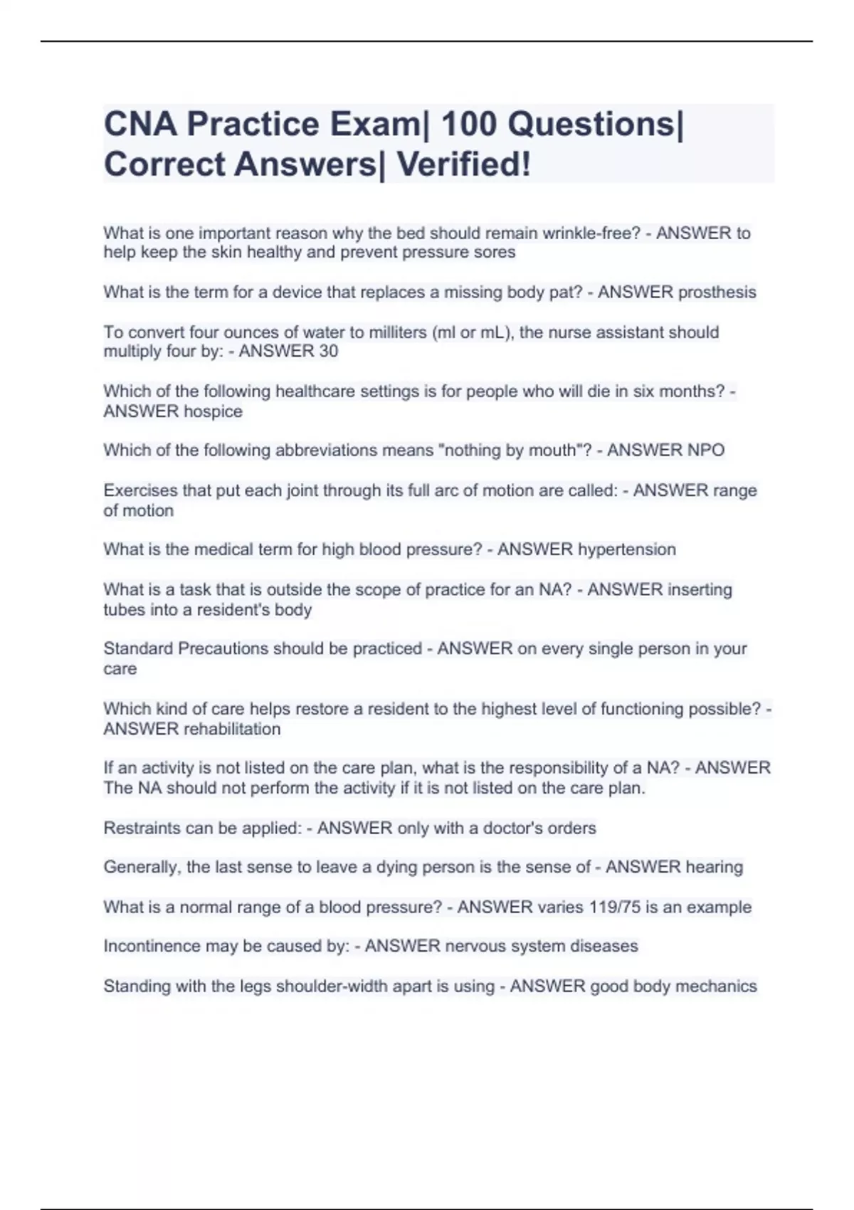 CNA Practice Exam| 100 Questions| Correct Answers| Verified!