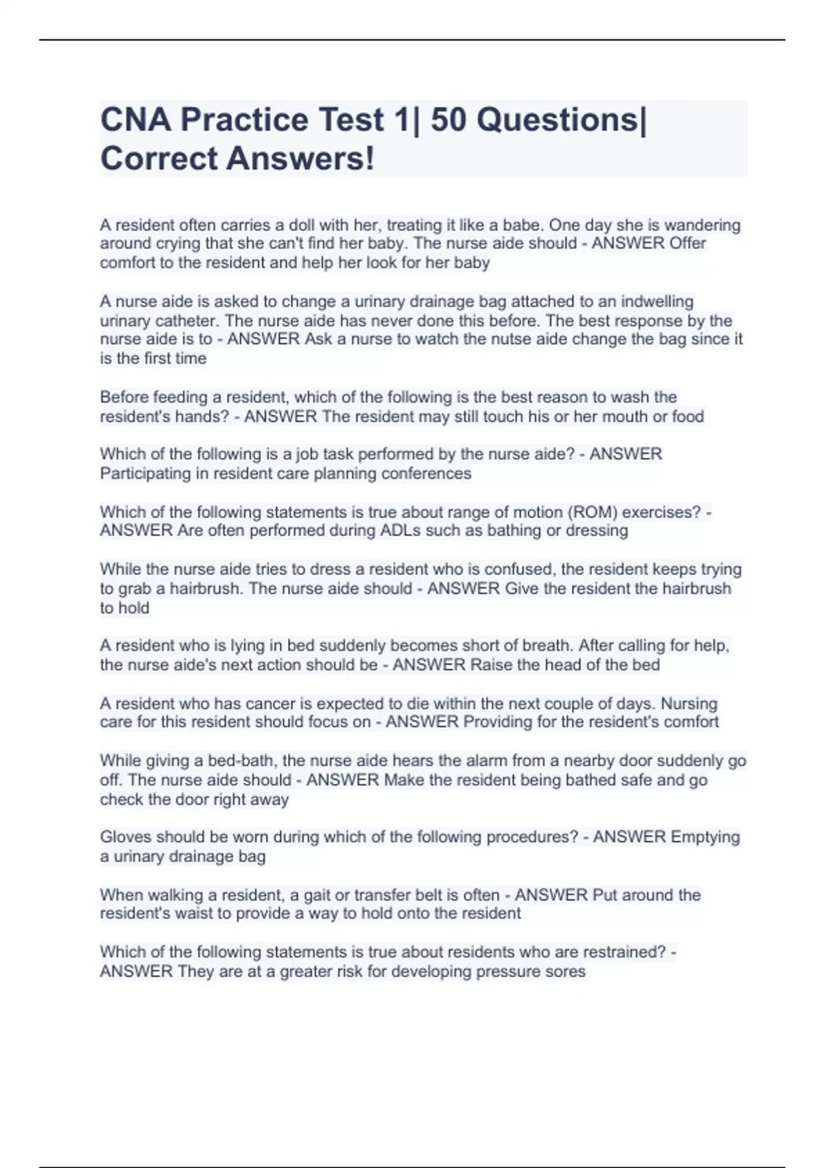 CNA Practice Test 1| 50 Questions| Correct Answers!