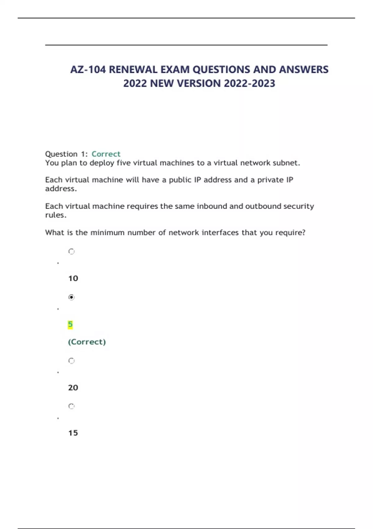 AZ-104 RENEWAL EXAM QUESTIONS AND ANSWERS 2022 NEW VERSION Question 1: Correct You plan to deploy five virtual machines to a virtual network subnet. Each virtual machine will have a public IP address and a private IP address. Each virtual machine requires the same inbound and outbound security rules. What is the minimum number of network interfaces that you require? • 10 • 5 (Correct) • 20 • 15 lOMoAR cPSD| (Correct) • Create a container instance • Register Getcloudskillsserver (Correct) • Download an automation scrip