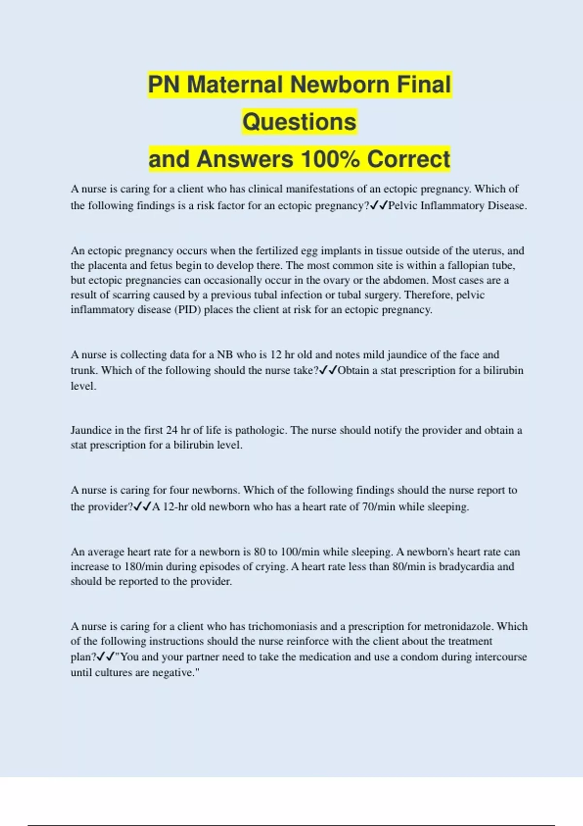 A nurse is caring for a client who has clinical manifestations of an ectopic pregnancy. Which of the following findings is a risk factor for an ectopic pregnancy?Pelvic Inflammatory Disease. An ectopic pregnancy occurs when the fertilized egg implants in tissue outside of the uterus, and the placenta and fetus begin to develop there. The most common site is within a fallopian tube, but ectopic pregnancies can occasionally occur in the ovary or the abdomen. Most cases are a result of scarring caused by a previous tubal infection or tubal surgery. Therefore, pelvic inflammatory disease (PID) places the client at risk for an ectopic pregnancy. A nurse is collecting data for a NB who is 12 hr old and notes mild jaundice of the face and trunk. Which of the following should the nurse take?Obtain a stat prescription for a bilirubin level. Jaundice in the first 24 hr of life is pathologic. The nurse should notify the provider and obtain a stat prescription for a bilirubin level. A nurse is caring for four newborns. Which of the following findings should the nurse report to the provider?A 12-hr old newborn who has a heart rate of 70/min while sleeping. An average heart rate for a newborn is 80 to 100/min while sleeping. A newborn's heart rate can increase to 180/min during episodes of crying. A heart rate less than 80/min is bradycardia and should be reported to the provider. A nurse is caring for a client who has trichomoniasis and a prescription for metronidazole. Which of the following instructions should the nurse reinforce with the client about the treatment plan?"You and your partner need to take the medication and use a condom during intercourse until cultures are negative."