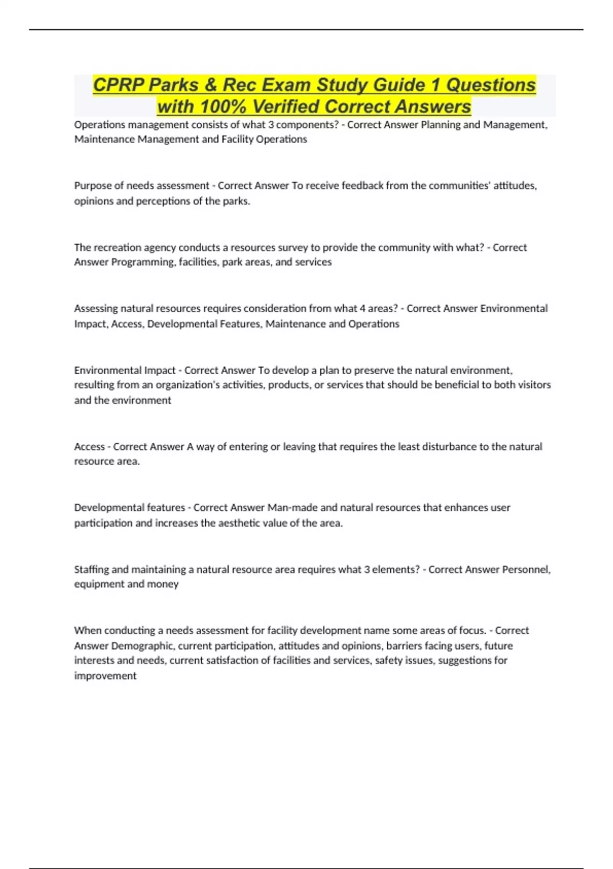 CPRP Parks & Rec Exam Study Guide 1 Questions with 100% Verified Correct Answers Operations management consists of what 3 components? - Correct Answer Planning and Management, Maintenance Management and Facility Operations Purpose of needs assessment - Correct Answer To receive feedback from the communities' attitudes, opinions and perceptions of the parks. The recreation agency conducts a resources survey to provide the community with what? - Correct Answer Programming, facilities, park areas, and services Assessing natural resources requires consideration from what 4 areas? - Correct Answer Environmental Impact, Access, Developmental Features, Maintenance and Operations Environmental Impact - Correct Answer To develop a plan to preserve the natural environment, resulting from an organization's activities, products, or services that should be beneficial to both visitors and the environment Access - Correct Answer A way of entering or leaving that requires the least disturbance to the natural resource area. Developmental features - Correct Answer Man-made and natural resources that enhances user participation and increases the aesthetic value of the area. Staffing and maintaining a natural resource area requires what 3 elements? - Correct Answer Personnel, equipment and money When conducting a needs assessment for facility development name some areas of focus. - Correct Answer Demographic, current participation, attitudes and opinions, barriers facing users, future interests and needs, current satisfaction of facilities and services, safety issues, suggestions for improvement