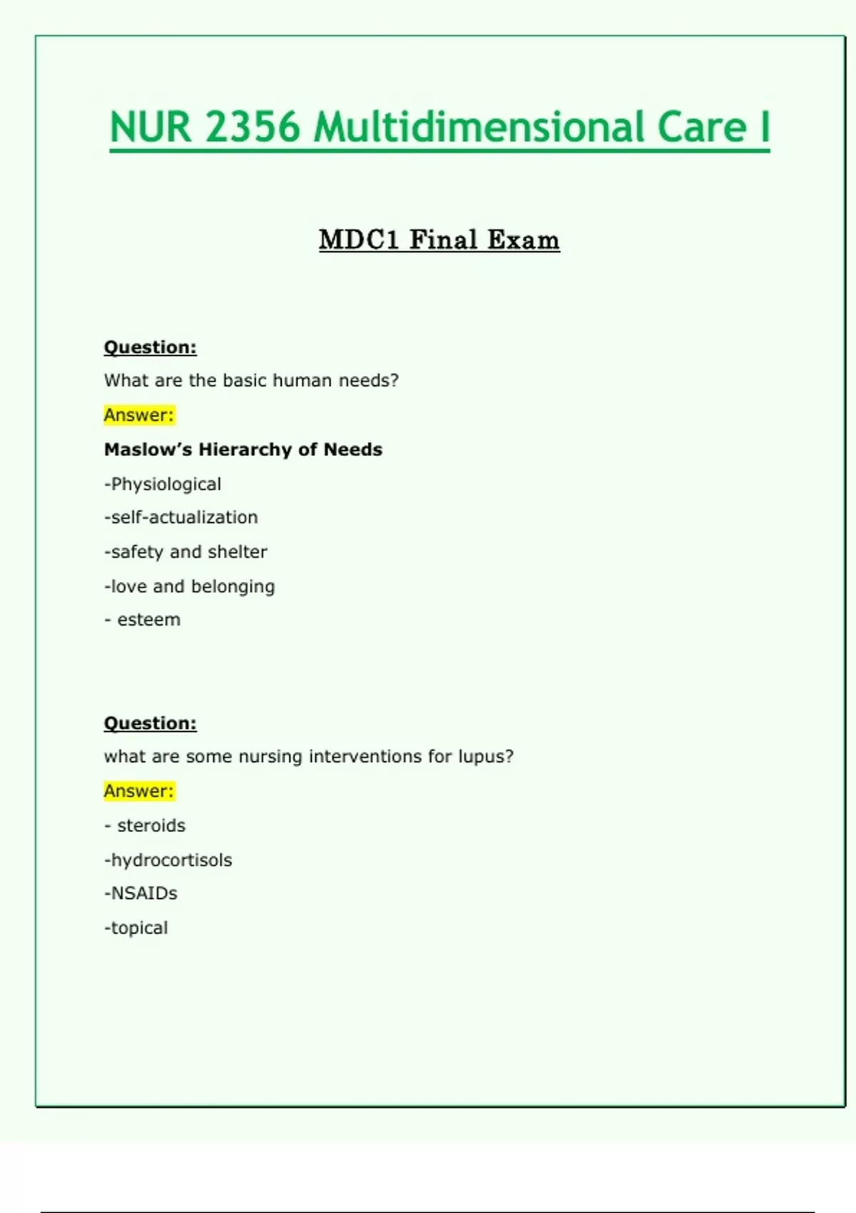 NUR 2356 / NUR2356: Multidimensional Care I / MDC 1 Final Exam (Latest 2024 / 2025) Rasmussen