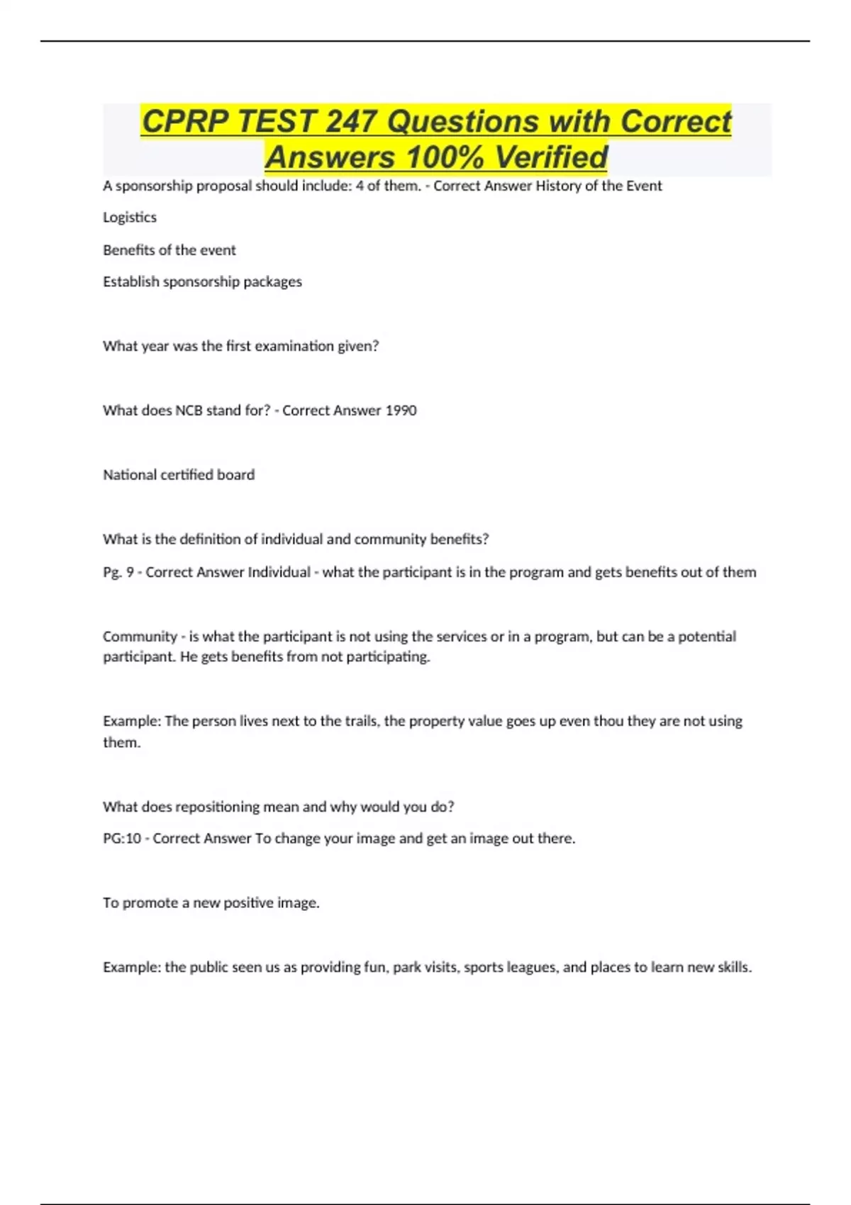 CPRP TEST 247 Questions with Correct Answers 100% Verified A sponsorship proposal should include: 4 of them. - Correct Answer History of the Event Logistics Benefits of the event Establish sponsorship packages What year was the first examination given? What does NCB stand for? - Correct Answer 1990 National certified board What is the definition of individual and community benefits? Pg. 9 - Correct Answer Individual - what the participant is in the program and gets benefits out of them Community - is what the participant is not using the services or in a program, but can be a potential participant. He gets benefits from not participating. Example: The person lives next to the trails, the property value goes up even thou they are not using them. What does repositioning mean and why would you do? PG:10 - Correct Answer To change your image and get an image out there. To promote a new positive image. Example: the public seen us as providing fun, park visits, sports leagues, and places to learn new skills.