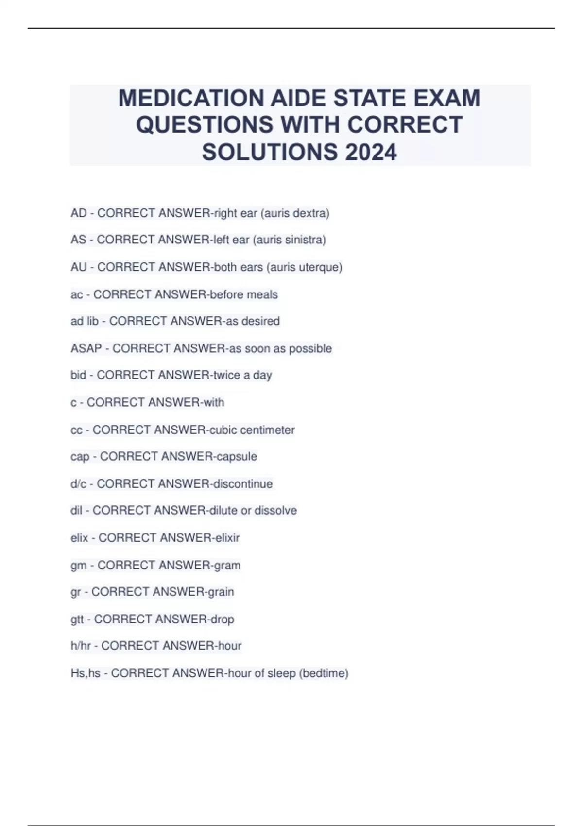 MEDICATION AIDE STATE EXAM QUESTIONS WITH CORRECT SOLUTIONS 2024 AD - CORRECT ANSWER-right ear (auris dextra) AS - CORRECT ANSWER-left ear (auris sinistra) AU - CORRECT ANSWER-both ears (auris uterque) ac - CORRECT ANSWER-before meals ad lib - CORRECT ANSWER-as desired ASAP - CORRECT ANSWER-as soon as possible bid - CORRECT ANSWER-twice a day c - CORRECT ANSWER-with cc - CORRECT ANSWER-cubic centimeter cap - CORRECT ANSWER-capsule d/c - CORRECT ANSWER-discontinue dil - CORRECT ANSWER-dilute or dissolve elix - CORRECT ANSWER-elixir gm - CORRECT ANSWER-gram gr - CORRECT ANSWER-grain gtt - CORRECT ANSWER-drop h/hr - CORRECT ANSWER-hour Hs,hs - CORRECT ANSWER-hour of sleep (bedtime) kg - CORRECT ANSWER-kilogram L - CORRECT ANSWER-liter MAR - CORRECT ANSWER-medication administration record MDI - CORRECT ANSWER-metered dose inhaler mEq - CORRECT ANSWER-milliequivalent mg - CORRECT ANSWER-milligram ml - CORRECT ANSWER-milliliter NPO - CORRECT ANSWER-nothing by mouth OD - CORRECT ANSWER-right eye (oculus dexter) OS - CORRECT ANSWER-left eye OU - CORRECT ANSWER-both eyes OTC - CORRECT ANSWER-over the counter otic - CORRECT ANSWER-ear ophth - CORRECT ANSWER-eye oz - CORRECT ANSWER-ounce pc - CORRECT ANSWER-after meals po - CORRECT ANSWER-by mouth PR - CORRECT ANSWER-per rectum PRN - CORRECT ANSWER-as needed q - CORRECT ANSWER-every q am - CORRECT ANSWER-every morning qd - CORRECT ANSWER-every day qh - CORRECT ANSWER-every hour