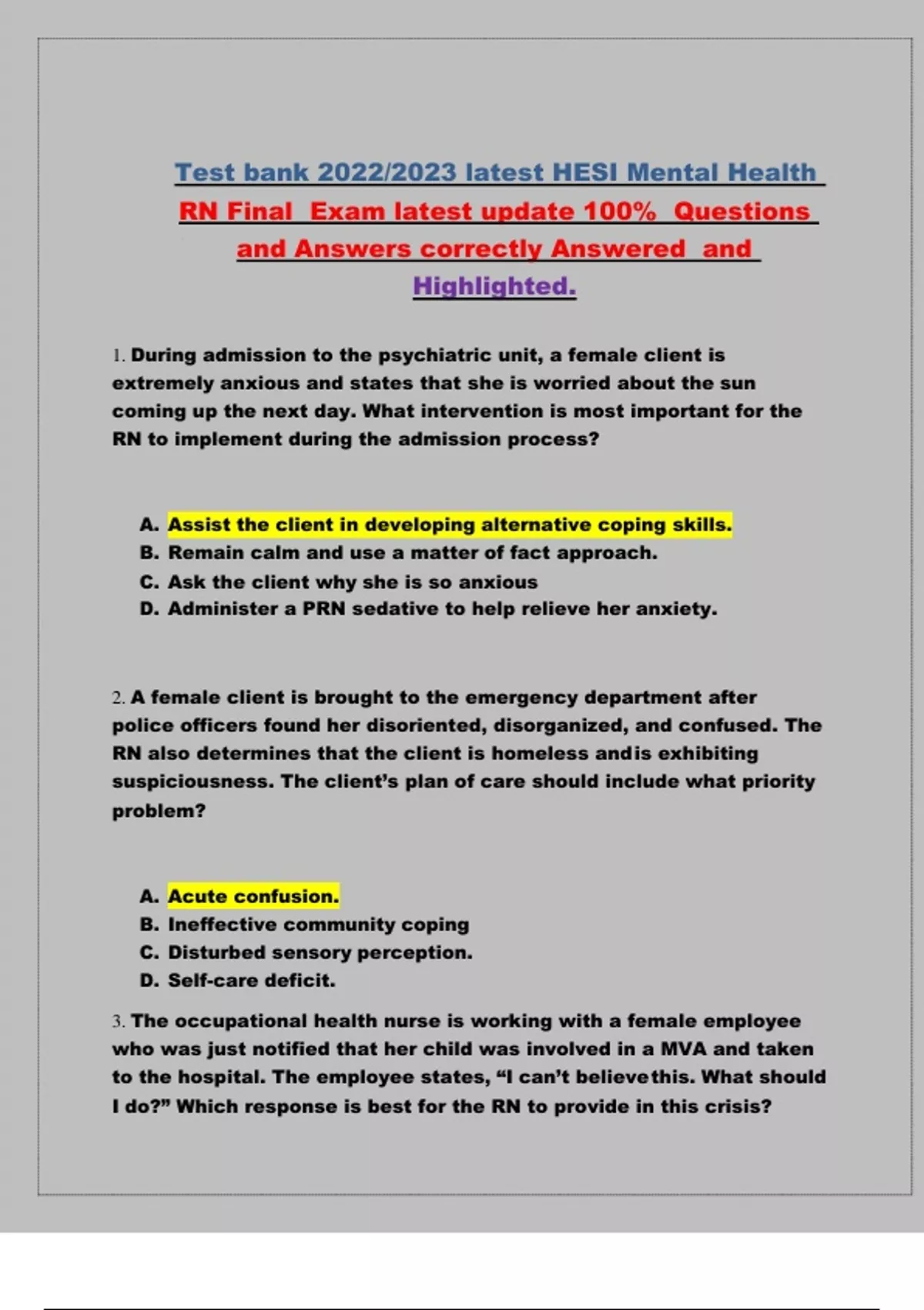 Test bank 2022/2023 latest HESI Mental Health RN Final Exam latest update 100% Questions and Answers correctly Answered and Highlighted. 1. During admission to the psychiatric unit, a female client is extremely anxious and states that she is worried about the sun coming up the next day. What intervention is most important for the RN to implement during the admission process? A. Assist the client in developing alternative coping skills. B. Remain calm and use a matter of fact approach. C. Ask the client why she is so anxious D. Administer a PRN sedative to help relieve her anxiety. 2. A female client is brought to the emergency department after police officers found her disoriented, disorganized, and confused. The RN also determines that the client is homeless and is exhibiting suspiciousness. The client’s plan of care should include what priority problem? A. Acute confusion. B. Ineffective community coping C. Disturbed sensory perception. D. Self-care deficit.