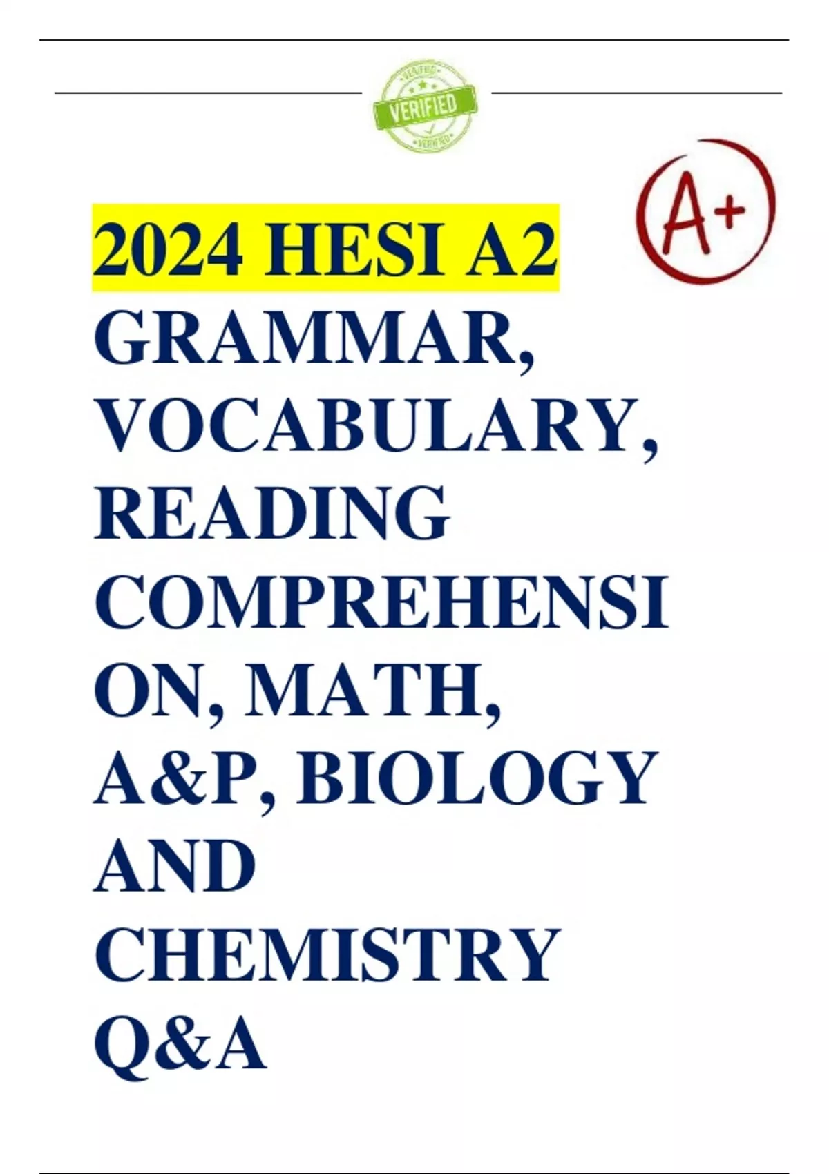 HESI A2 V2 QUESTIONS AND ANSWERS GRAMMAR, VOCABULARY, READING COMPREHENSION, MATH, A&P, BIOLOGY AND CHEMISTRY 2024