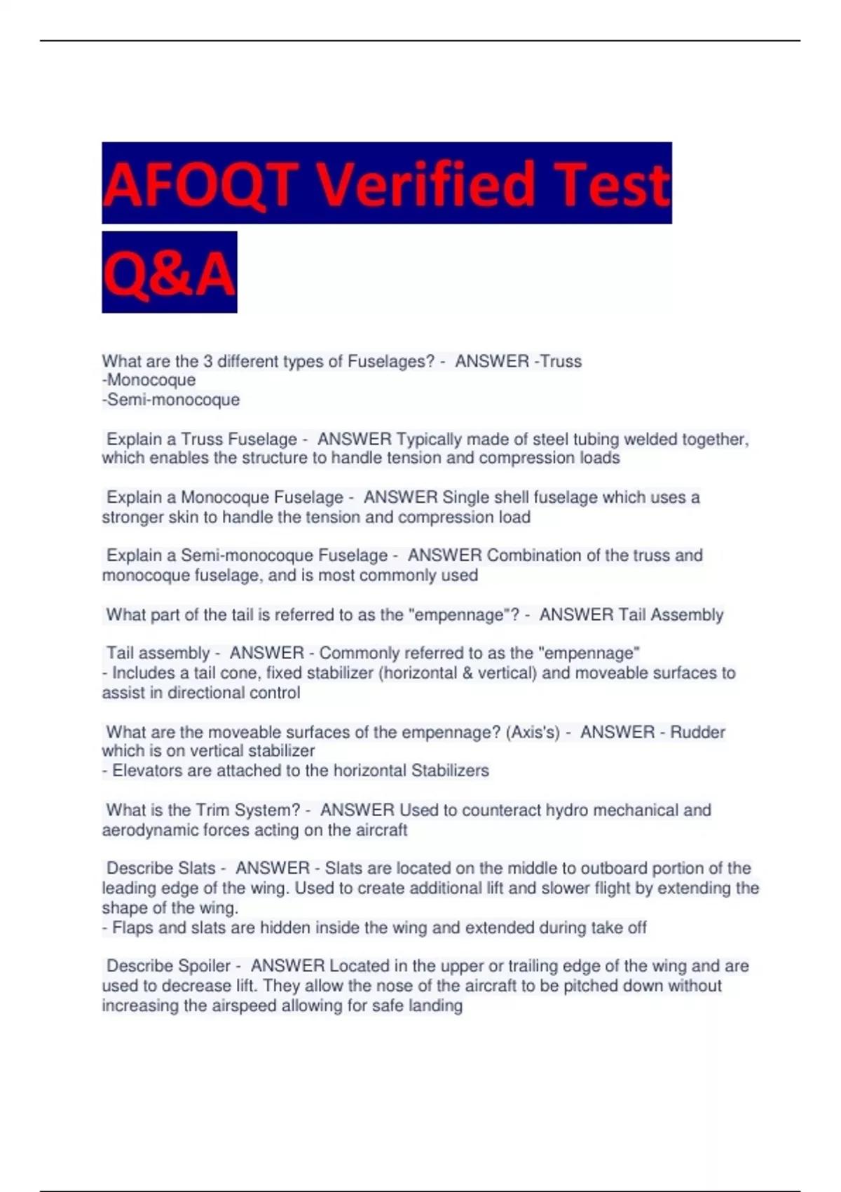 AFOQT Verified Test Q&A What are the 3 different types of Fuselages? - ANSWER -Truss -Monocoque -Semi-monocoque Explain a Truss Fuselage - ANSWER Typically made of steel tubing welded together, which enables the structure to handle tension and compression loads Explain a Monocoque Fuselage - ANSWER Single shell fuselage which uses a stronger skin to handle the tension and compression load Explain a Semi-monocoque Fuselage - ANSWER Combination of the truss and monocoque fuselage, and is most commonly used What part of the tail is referred to as the "empennage"? - ANSWER Tail Assembly Tail assembly - ANSWER - Commonly referred to as the "empennage" - Includes a tail cone, fixed stabilizer (horizontal & vertical) and moveable surfaces to assist in directional control What are the moveable surfaces of the empennage? (Axis's) - ANSWER - Rudder which is on vertical stabilizer - Elevators are attached to the horizontal Stabilizers What is the Trim System? - ANSWER Used to counteract hydro mechanical and aerodynamic forces acting on the aircraft Describe Slats - ANSWER - Slats are located on the middle to outboard portion of the leading edge of the wing. Used to create additional lift and slower flight by extending the shape of the wing. - Flaps and slats are hidden inside the wing and extended during take off Describe Spoiler - ANSWER Located in the upper or trailing edge of the wing and are used to decrease lift. They allow the nose of the aircraft to be pitched down without increasing the airspeed allowing for safe landing Describe Flaps - ANSWER - These are the hinged portion of the wing trailing edge between ailerons and the fuselage. Sometimes may be located on the leading edge of wing. - If USED during take off, flaps reduce the amount of runway and time needed to take off. - During LANDINGS flaps increase the drag on the wings slowing the plane down and to go slower during landing, reducing the amount of runway needed. - BASICALLY, flaps allow aircraft to make more lift at slower speeds List the Secondary Flight Controls - ANSWER - Flaps - Slats - Spoilers - Speed Brake - Trim system Describe the Rudder - ANSWER Mounted on the trailing edge of the vertical fin and is used for controlling rotation (YAW) around the vertical axis Describe Ailerons - ANSWER Mounted on the trailing edges of the wings and are used for controlling aircraft roll about the longitudinal axis - located on the outer, trailing edges of the wings, Describe Elevators - ANSWER Mounted
