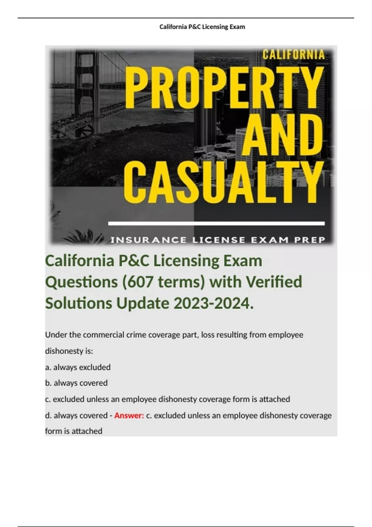 California P&C Licensing Exam Questions (607 terms) with Verified Solutions Update . Terms like; Under the commercial crime coverage part, loss resulting from employee dishonesty is: a. always excluded b. always covered c. excluded unless an empl