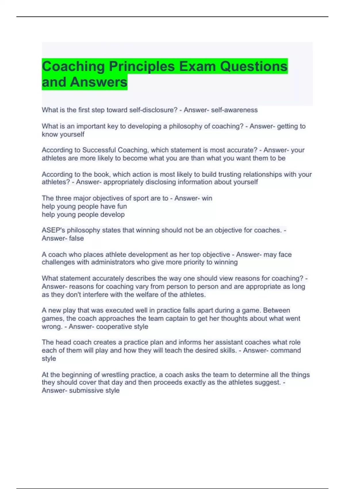 Coaching Principles Exam Questions and Answers