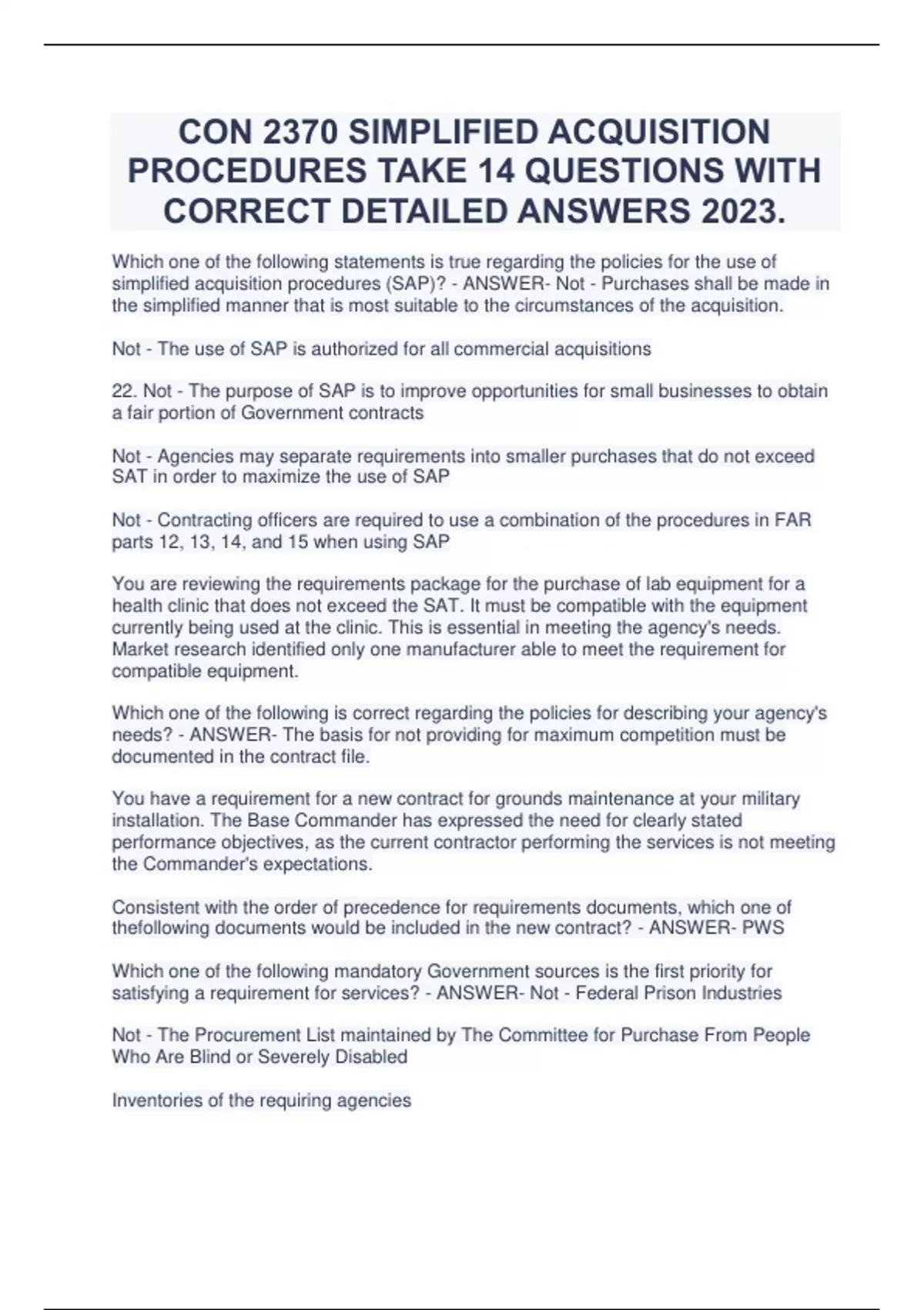 CON 2370 SIMPLIFIED ACQUISITION PROCEDURES TAKE 14 QUESTIONS WITH CORRECT DETAILED ANSWERS 2023.