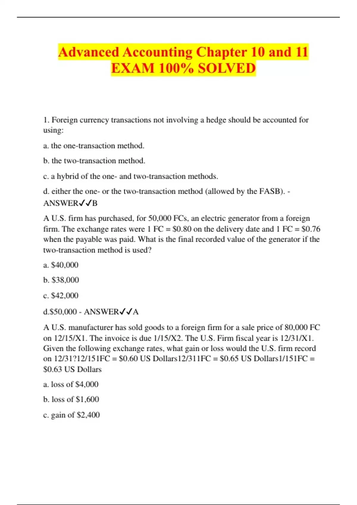Advanced Accounting Chapter 10 and 11 EXAM 100% SOLVED 1. Foreign currency transactions not involving a hedge should be accounted for using: a. the one-transaction method. b. the two-transaction method. c. a hybrid of the one- and two-transaction methods. d. either the one- or the two-transaction method (allowed by the FASB). - ANSWERB A U.S. firm has purchased, for 50,000 FCs, an electric generator from a foreign firm. The exchange rates were 1 FC = $0.80 on the delivery date and 1 FC = $0.76 when the payable was paid. What is the final recorded value of the generator if the two-transaction method is used? a. $40,000 b. $38,000 c. $42,000 d.$50,000 - ANSWERA A U.S. manufacturer has sold goods to a foreign firm for a sale price of 80,000 FC on 12/15/X1. The invoice is due 1/15/X2. The U.S. Firm fiscal year is 12/31/X1. Given the following exchange rates, what gain or loss would the U.S. firm record on 12/31?12/151FC = $0.60 US Dollars12/311FC = $0.65 US Dollars1/151FC = $0.63 US Dollars a. loss of $4,000 b. loss of $1,600 c. gain of $2,400 d. gain of $4,000 - ANSWERD . On August 1, 20X1, an American firm purchased a machine costing 200,000,000 yen from a Japanese firm to be paid for on October 1, 20X1. Also on August 1, 20X1, the American firm entered into a contract to purchase 200,000,000 yen to be delivered on October 1, 20X1, at a forward rate of 1 Yen = $0.00783. The exchange rates were as follows: Spot August 1, 20X11 Yen = $0.00781August 31, 20X11 Yen = $0.00777October 1, 20X11 Yen = $0.00779Which of the following statements is incorrect concerning t