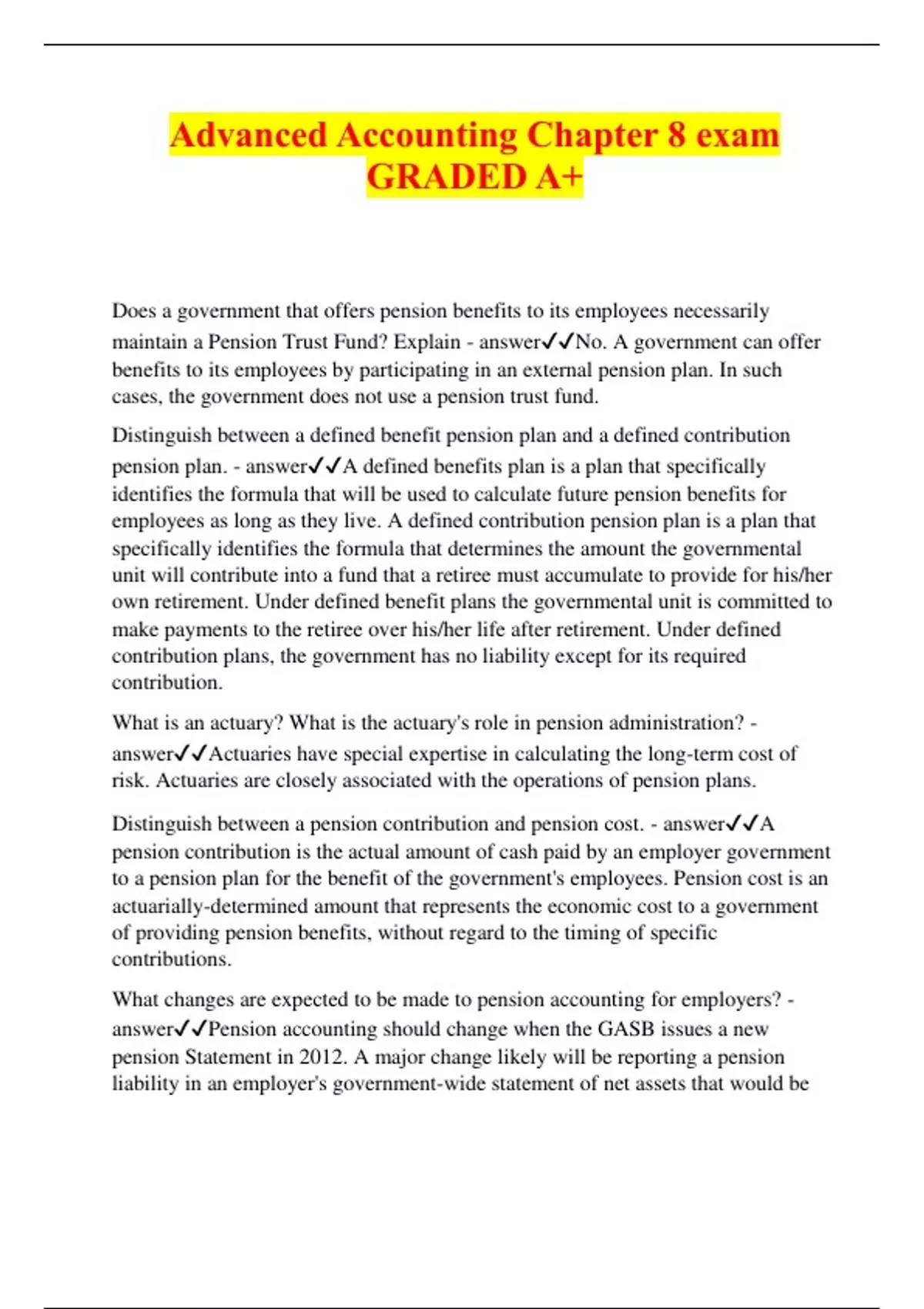 Advanced Accounting Chapter 8 exam GRADED A+ Does a government that offers pension benefits to its employees necessarily maintain a Pension Trust Fund? Explain - answerNo. A government can offer benefits to its employees by participating in an external pension plan. In such cases, the government does not use a pension trust fund. Distinguish between a defined benefit pension plan and a defined contribution pension plan. - answerA defined benefits plan is a plan that specifically identifies the formula that will be used to calculate future pension benefits for employees as long as they live. A defined contribution pension plan is a plan that specifically identifies the formula that determines the amount the governmental unit will contribute into a fund that a retiree must accumulate to provide for his/her own retirement. Under defined benefit plans the governmental unit is committed to make payments to the retiree over his/her life after retirement. Under defined contribution plans, the government has no liability except for its required contribution. What is an actuary? What is the actuary's role in pension administration? - answerActuaries have special expertise in calculating the long-term cost of risk. Actuaries are closely associated with the operations of pension plans. Distinguish between a pension contribution and pension cost. - answerA pension contribution is the actual amount of cash paid by an employer government to a pension plan for the benefit of the government's employees. Pension cost is an actuarially-determined amount that represents the economic cost to a government of providing pension benefits, without regard to the timing of specific contributions