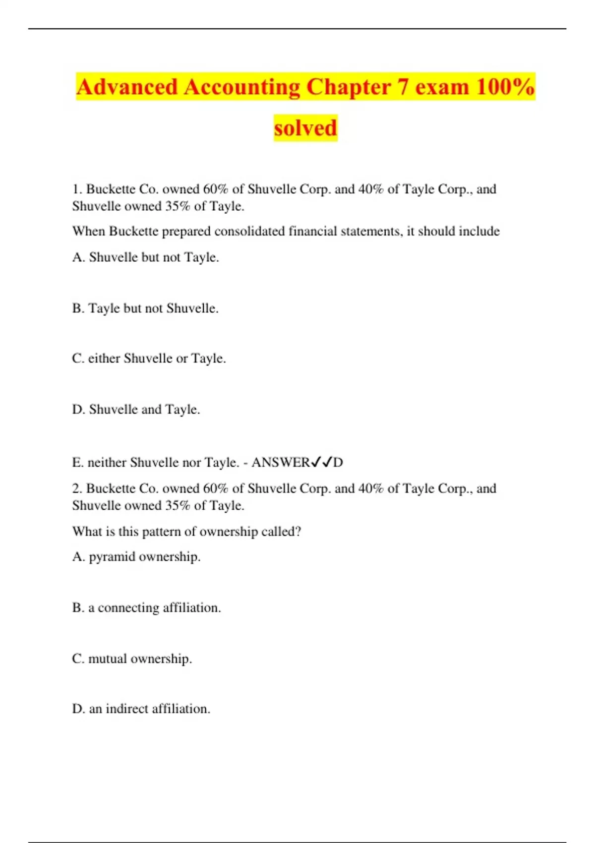 Advanced Accounting Chapter 7 exam 100% solved 1. Buckette Co. owned 60% of Shuvelle Corp. and 40% of Tayle Corp., and Shuvelle owned 35% of Tayle. When Buckette prepared consolidated financial statements, it should include A. Shuvelle but not Tayle. B. Tayle but not Shuvelle. C. either Shuvelle or Tayle. D. Shuvelle and Tayle. E. neither Shuvelle nor Tayle. - ANSWERD 2. Buckette Co. owned 60% of Shuvelle Corp. and 40% of Tayle Corp., and Shuvelle owned 35% of Tayle. What is this pattern of ownership called? A. pyramid ownership. B. a connecting affiliation. C. mutual ownership. D. an indirect affiliation. E. an affiliated group. - ANSWERB 3. Buckette Co. owned 60% of Shuvelle Corp. and 40% of Tayle Corp., and Shuvelle owned 35% of Tayle. What percentage of Tayle's income is attributed to Buckette's ownership interest? A. 100%. B. 75%. C. 61%. D. 40%. E. 74%. - ANSWERC 40% + 21% [60% × 35%] = 61% 4. D Corp. had investments, direct and indirect, in several subsidiaries: • E Co. is a domestic firm in which D Corp. owned a 90% interest • F Co. is a domestic firm in which D Corp. owned 60% and E Co. owned 30% • G Co. is a domestic firm wholly owned by E Co. • H Co. is a foreign subsidiary in which D Corp. owned a 90% interest • I Co. is a domestic firm in which D Corp. owned 50% and G Co. owned 25% Which of these subsidiaries may be included in a consolidated income tax return? A. E, F, G, H, and I. B. E, G, H, and I. C. E and F. D. E, F, G, and H. E. E, F, and G. - ANSWERE 5. Evanston Co. owned 60% of Montgomery Corp. Montgomery owned 75% of Noir Inc., and Noir owned 15% of Montgomery. This pattern of ownership would be called A. mutual ownership. B. direct control. C. indirect control. D. an affiliated group. E. a connecting affiliation. - ANSWERA 6. In a tax-free business combination, A. the income tax basis for acquired assets and liabilities is adjusted to current fair value. B. any goodwill created by the combination may be amortized in calculating taxable income. C. the subsidiary's assets and liabilities are assigned an income tax basis of zero dollars, so that they will have no future income tax consequences. D. any goodwill created by the combination must be deducted in total in calculating taxable income. E. the subsidiary's cost basis for assets are retained for income tax calculations. - ANSWERE
