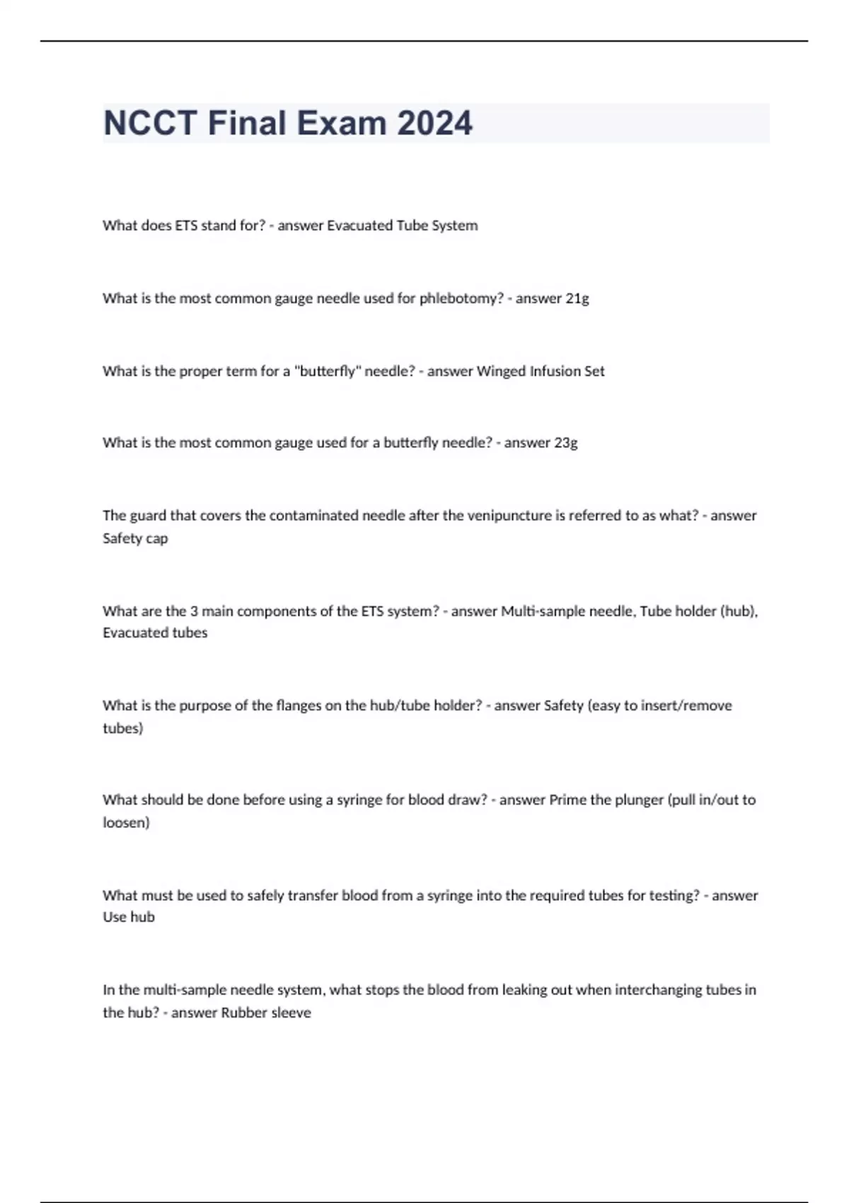 NCCT Final Exam 2024 What is the proper term for a "butterfly" needle? Winged Infusion Set What is the most common gauge used for a butterfly needle? 23g The guard that covers the contaminated needle after the venipuncture is referred to as what? Safety cap What are the 3 main components of the ETS system? Multi-sample needle, Tube holder (hub), Evacuated tubes