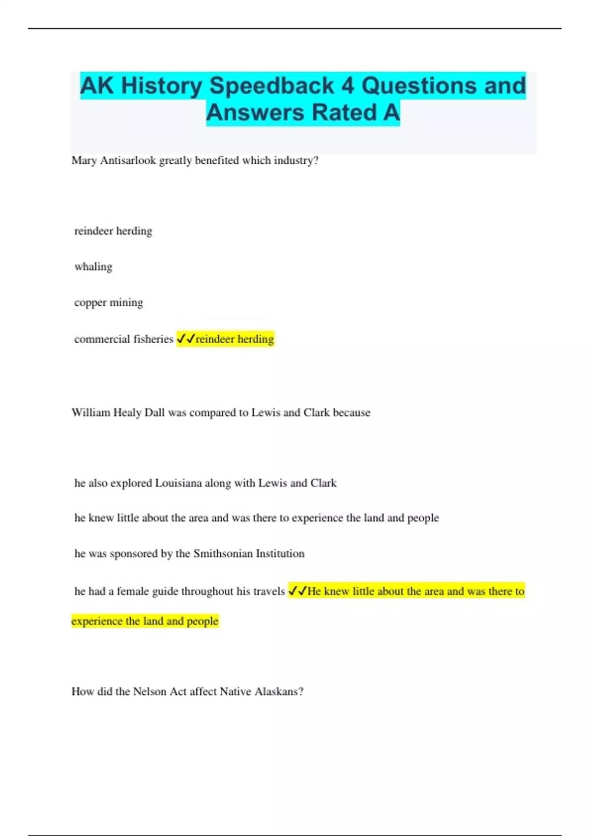 AK History Speedback 4 Questions and Answers Rated A Mary Antisarlook greatly benefited which industry? reindeer herding whaling copper mining commercial fisheries reindeer herding William Healy Dall was compared to Lewis and Clark because he also explored Louisiana along with Lewis and Clark he knew little about the area and was there to experience the land and people he was sponsored by the Smithsonian Institution he had a female guide throughout his travels He knew little about the area and was there to experience the land and people How did the Nelson Act affect Native Alaskans? it created a dual system of schooling it created a reservation system it led to the opportunity to challenge laws that went against Native Alaskans it led to the establishment of Native corporations It created a dual system of schooling In his letter, what does Joseph Wilson say will happen if the U.S. decides not to purchase Alaska? A large amount of money will be saved that could be used for better purposes The American people will be happier with the U.S. government Russia will begin to dominate the land further south down the Pacific coast. European nations will be encouraged to intrude on the American continent European nations will be encouraged to intrude on the american continent. What was the Treaty of Cession? the agreement to cease fire during the Crimean War the agreement to cease fire between the United States and Russia the agreement of purchase between Russia and the United States the agreement of purchase between Native Alaskans and the United States The agreement of purchases between Russia and the United States According to the Treaty of Cession, which of the following were NOT ceded from Russia to the United States? churches and private individual property unoccupied lands and public buildings public lots and squares army fortifications and barracks Churches and private individual property In the beginning, the United States was not interested in buying Alaska because they weren't interested in Alaska at all they were worried about the coming Civil War they already had enough land the price was too steep They were worried about the coming Civil War. Which groups were NOT in favor of the purchase of Alaska? Native Alaskans military men businessmen who conducted business in China American fur trappers Native Alaskans To whom does the Constitution give the plenary right over Native Americans? Native Alaskans the state of Alaska Congress The President of the U.S. and the governor of Alaska Congress Why have commercial fisheries been controversial in Alaska? lack of workers necessitate foreign employees high profits have resulted in a quickly-increasing population environmental concerns related to the disposal of unused fish parts ownership and control by non-Alaskans and the federal government ownership and control by non-Alaskans and the federal government. At the time of the purchase of Alaska most of the early information about the interior of Alaska came from James Cook Native Alaskans Spanish explorers Russian explorers Native Alaskans The purchase of Alaska became known as "Seward's Folly" because the purchase was finalized during a bribery scandal The American people will be happier with the U.S. government many felt that Alaska's resources didn't warrant the money spent Russia will begin to dominate the land further south down the Pacific coast. Many felt that Alaska's resources didn't warrant the money spent. According to the Treaty of Cession, what will happen to Russian citizens living in the Alaska territory following the purchase by the United States? They automatically become U.S. citizens They must return to Russia within 3 years They can return to Russia in the next 3 years or become U.S. citizens. They will be forcibly removed from the Alaska territory They can return to Russia within 3 years or become U.S. citizens. What does the Organic Act say about the land claims of Native Alaskans? They can keep land that is less than six hundred and forty acres per site They can continue to use their claimed lands undisturbed They will be given titles to the land they have claimed Their land will be redistributed to incoming U.S. citizens. They can continue to use their claimed lands undisturbed. According to the Organic Act, what were the laws for Alaska borrowed from? the Organic Act of Hawaii existing Russian law laws of Oregon the United States Constitution Laws of Oregon What is the Organic Act of 1884? the act creating the territory of Alaska the act by Congress to purchase Alaska Alaska's first treaty with Native Alaskans the act organizing Alaska's first government The act organizing Alaska's first government. How has John Muir's legacy continued in Alaska? through legislation passed on behalf of Native Alaskans through the conservation efforts of various groups through efforts to promote literacy in Alaska through the development of the Alaska Commercial Company Through the conservation efforts of various groups. What is the Marshall Trilogy? a series of court decisions a series of inventions benefiting commercial fisheries a series of books written about Native Alaskans a series of battles securing United States annexation of Alaska A series of court decisions Why is coal not mined as extensively now as it was during the district period? So much coal was mined in the district period that there isn't much left. The demand for coal is much higher now than it was during the district period. There are strict government restrictions on coal mining in Alaska. The quality and accessibility of the coal is not worth the cost of mining it. The quality and accessibility of the coal is not worth the cost of mining it. 20. Sheldon Jackson was primarily known for his missionary efforts throughout Alaska being a representative of the Alaska Commercial Company establishing the Sierra Club exploring the interior of Alaska His missionary efforts throughout Alaska.