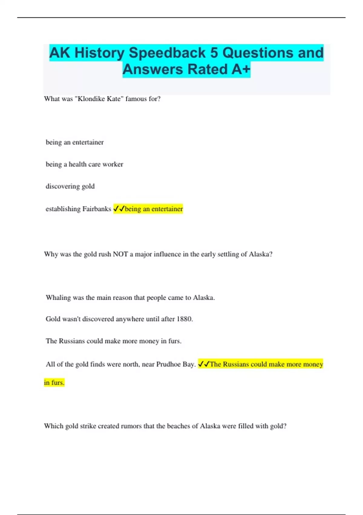AK History Speedback 5 Questions and Answers Rated A+ What was "Klondike Kate" famous for? being an entertainer being a health care worker discovering gold establishing Fairbanks being an entertainer Why was the gold rush NOT a major influence in the early settling of Alaska? Whaling was the main reason that people came to Alaska. Gold wasn't discovered anywhere until after 1880. The Russians could make more money in furs. All of the gold finds were north, near Prudhoe Bay. The Russians could make more money in furs. Which gold strike created rumors that the beaches of Alaska were filled with gold? Circle City Nome Fairbanks the Klondike Nome What problem was unique to the White Horse Pass? Directions to it were unreliable. It could only be used part of the year. It had a narrow trail. The weather in the area was harsh. It had a narrow trail. Besides being controlled by the mining company, how else might a mining town have been governed? locally appointed officials temporary rules that changed according to what the majority wanted mining towns were essentially lawless permanent laws that were established when the town was organized Temporary rules that changed according to what the majority wanted. Which of the following is NOT true of the impact that the gold strikes had in Alaska during the 1800s to 1900s? benefited local economies brought in new settlers improved Alaska's standing in the nation's eyes benefited Native Alaskans Benefited Native Alaskans. Where was the first major gold strike in Alaska? Nome the Klondike region Fairbanks Juneau Juneau What were the "Golden Stairs"? a mountain range that looked like stairs stairs cut out of ice that led people to the Klondike part of the Iditarod trail one of the main passes used to get to the gold fields in Nome Stairs cut out of ice that led people to the Klondike Why did Canadian mounties assign numbers to rafts coming in through the all-water route? to show that the raft had paid the entrance fees to identify bodies easier to regulate the flow of rafts to help suppliers find their customers To identify bodies easier. Which of the following was true of gold rush mining towns? Houses were built well apart from one another. Most of the towns had an active social life. Most of the residents were single men. Most residents stayed in the towns they grew up in. Most of the residents were single men. Which of the following options is NOT true concerning women in the district period? They were involved in a multitude of enterprises. They started many types of businesses during the district period. They mostly came to teach school. Some of them actively mined for gold. They mostly came to teach school. How were the railroads and mining interrelated? the trains were used to create the mines the railroad needed the mines in order to be profitable the mines needed the railroads in order to be profitable the miners built the railroads The mines needed the railroads in order to be profitable. What factor did NOT contribute to the spread of disease in mining towns? frozen ground cramped quarters mosquitoes poor ventilation mosquitoes. How is Jack London associated with Alaska? He was a newspaper editor who wrote extensively about Alaska. His biography was the highest selling book by an Alaskan author. He experienced the typical life of a person in Alaska and wrote about it fictionally. He wrote a daily journal about his travels to Alaska. He experienced the typical life of a person in Alaska and wrote about it fictionally. According to the journal entries provided in the lesson, if a new stampeder was in a hurry to get to the gold mines of the North where would he or she be most likely to disembark? Barrow Anchorage Juneau Valdez Valdez If you were a conservationist living in Alaska, why would you have been concerned about the Mining Law of 1872? It created an opportunity for cheap land which could lead to misuse. It put the federal government in control of parceling out land associated with mining. It put the state of Alaska in charge of mining. It did not allow Native Alaskans to own land. It created an opportunity for cheap land which could lead to misuse. What is the main purpose of the National Archives? to direct museum activities throughout the nation to house Alaskan artifacts to direct library activity throughout the United States to house artifacts that have helped develop the United States To house artifacts that have helped develop the United States. How did the Mining Law of 1872 affect Native Alaskans? It did not affect them since Native Alaskans were not U.S. citizens. It protected land that was traditionally owned by Native Alaskans. It protected any land that was part of a reservation. It did not allow Native Alaskans to purchase any of the mining land. It did not allow Native Alaskans to purchase any of the mining land. What is the main reason that a person would move for political reasons? they are following those of a similar faith disagreement with established power structures they want a fresh start with different friends finding a new job Disagreement with established power structures. What factor did NOT contribute to the spread of disease in mining towns? frozen ground cramped quarters mosquitoes poor ventilation mosquitoes.