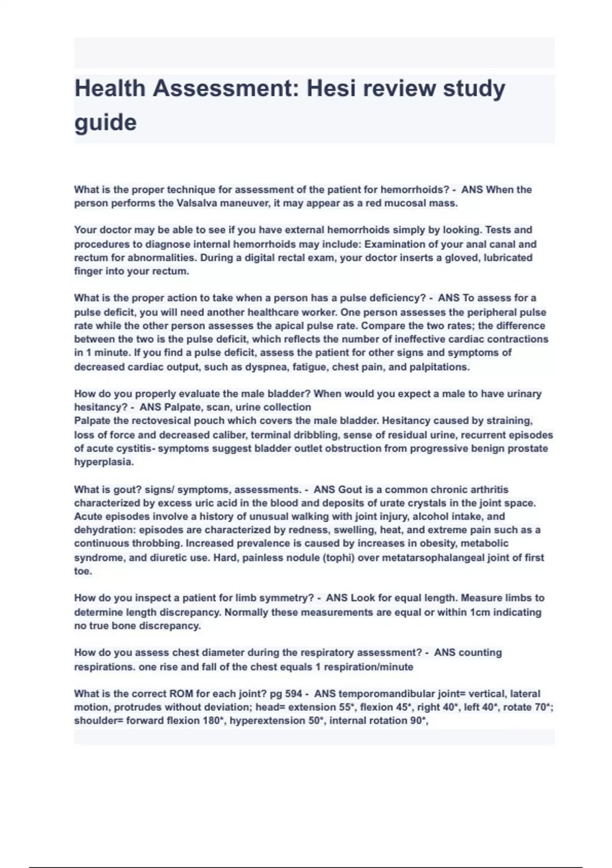 Health Assessment: Hesi review study guide Exam Questions with correct Answers 2024/2025 A+ GRADED.