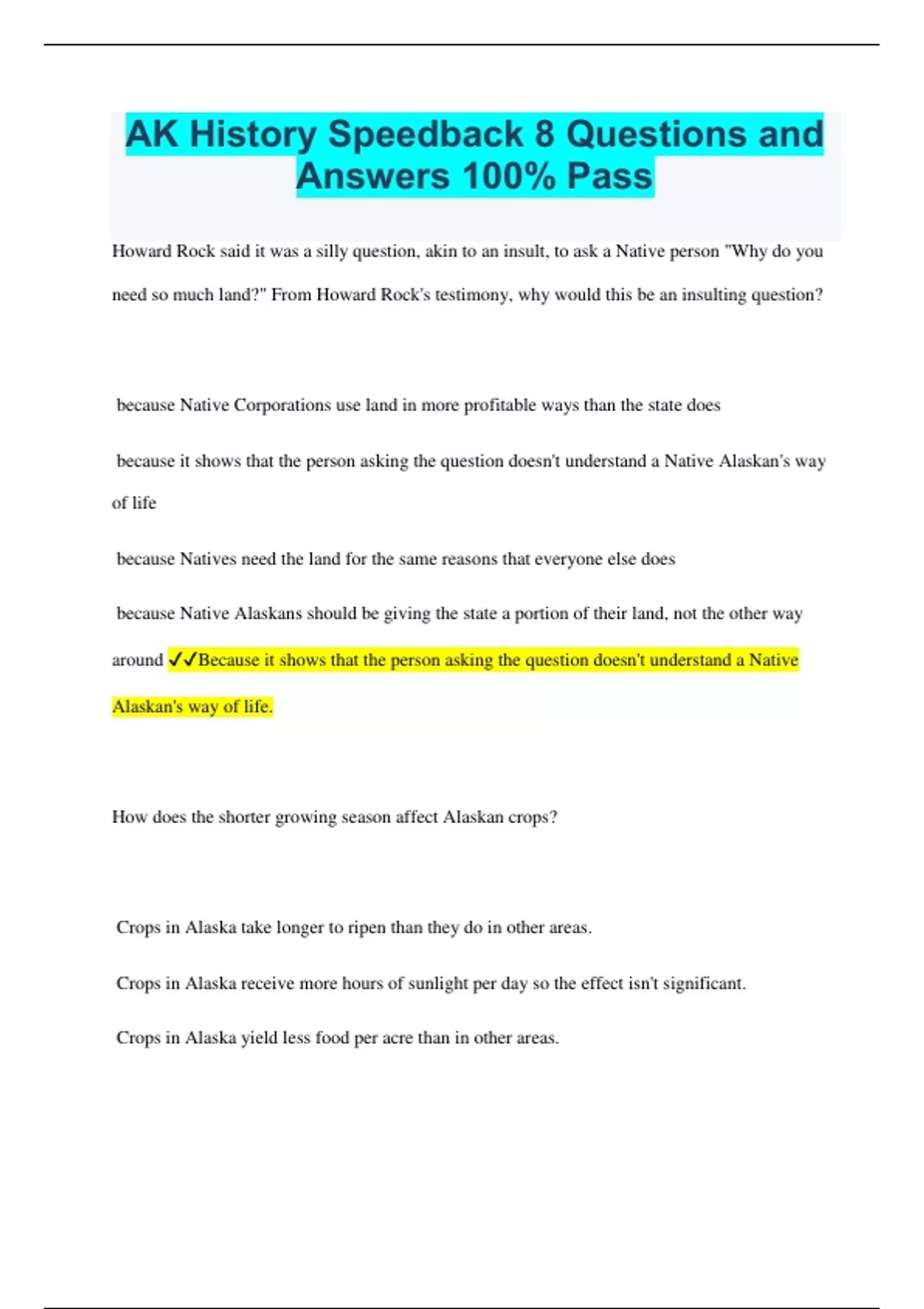 AK History Speedback 8 Questions and Answers 100% Pass Howard Rock said it was a silly question, akin to an insult, to ask a Native person "Why do you need so much land?" From Howard Rock's testimony, why would this be an insulting question? because Native Corporations use land in more profitable ways than the state does because it shows that the person asking the question doesn't understand a Native Alaskan's way of life because Natives need the land for the same reasons that everyone else does because Native Alaskans should be giving the state a portion of their land, not the other way around Because it shows that the person asking the question doesn't understand a Native Alaskan's way of life. How does the shorter growing season affect Alaskan crops? Crops in Alaska take longer to ripen than they do in other areas. Crops in Alaska receive more hours of sunlight per day so the effect isn't significant. Crops in Alaska yield less food per acre than in other areas. Crops grown in Alaska are smaller but more flavorful than food grown in other areas. Crops in Alaska receive more hours of sunlight per day so the effect isn't significant How does permafrost affect construction in Alaska? the law has limited construction on permafrost sites buildings must be set on pylons permafrost raises the cost of building it is impossible to construct buildings on permafrost Permafrost raises the cost of building What happened to speed up approval for the Alaska Pipeline? OPEC put limits on the amount of oil shipped to the United States as a response to American foreign policy. The Exxon Valdez spill showed a need for more reliable oil transportation. The price of oil skyrocketed due to oil shortages around the world. Federal control of the lands needed for the pipeline would be given to the state unless it was used by a certain deadline. OPEC put limits on the amount of oil shipped to the United States as a response to the American foreign policy Why were Native Alaskans wary of the pipeline being built? They knew that there would be negatives from the pipeline, and that it might not benefit them at all. Its proposed path of construction went through land that they had already been promised. They were skeptical about how profitable the pipeline would be for the state of Alaska. They thought the sheer distance of the pipeline and the difficult building conditions would doom the project. They knew that there would be negatives from the pipeline, and that it might not even benefit them at all. According to Howard Rock, what is the primary reason that Native Alaskans need more land than Native Americans in other states? Native Alaskan villages need extensive land for farming. Native Alaskan villages rely on hunting the land for food. Native Alaskan villages should keep the land they had before. Native Alaskan villages cover land that is mostly frozen and unusable. Native Alaskan villages rely on hunting the land for food. Which company is the largest provider of communication systems in Alaska? the US government GCI Verizon communications ALASCOM ALASCOM What major strike occurred in 1968 and signaled the beginning of the oil boom? Swanson River Prudhoe Bay ANWR Colville River Prudhoe bay. Why was ANILCA created? to resolve unsettled land issues with ANCSA to settle land claims between Native Alaskans and the state government to resolve land issues between Native Alaskans and the federal government to settle land claims issues with the AFN To resolve unsettled land issues with ANCSA How does the military affect neighboring communities? allows for increased land use drains the local economies creates additional tax burdens for the communities creates additional jobs in the communities Creates additional jobs in the communities. Katie John successfully sued the state and federal government for protection of her subsistence rights. How did this affect other Native Alaskans? Other Native Alaskans were given this same protection of their subsistence rights. A committee was formed to better protect the rights of all Native Alaskans. Native Alaskans around the state began suing to get the same rights. It sparked the creation of Native Corporations. Other Native Alaskans were given this same protection of their subsistence rights. Oil is the leading industry in Alaska. Which is the second leading industry in Alaska? seafood copper tourism timber Seafood What is one of the benefits that Native Alaskans gain from having Native Corporations? They can create specific laws as long as they only apply to Native Alaskans in their areas. They represent Native interests in politics, especially on issues such as discrimination. They organize social events for Native Alaskans in their respective areas. They provide non-profit federal and state healthcare programs for rural areas. They provide non-profit federal and state healthcare programs for rural areas. What was the main purpose of the ANCSA agreement? to settle disputes over Russian claims on the land to disperse the nine hundred million dollars offered by the federal government to conserve the land to settle land claims to settle land claims How has shipping changed in Alaska in the last fifty years? All ships entering Alaska are the size of supertankers. Shipping has become more focused on tourism rather than goods. Shipping has declined in use, due to other forms of transportation. Steamships have been replaced by a variety of other ships. Steamships have been replaced by a variety of other ships. Why is the "Alaska Grown" label important to Alaska? It shows that the produce is organically produced. It restricts competition among farmers. It promotes the production of food in Alaska. It is mandated by the Alaskan government. It promotes the production of food in Alaska, Which law established Native Corporations? Indian Reorganization Act ANCSA ANILCA Molly Hootch case ANCSA Where did the funding for the Alaska Highway come from? the Federal Highway Act a compromise wit