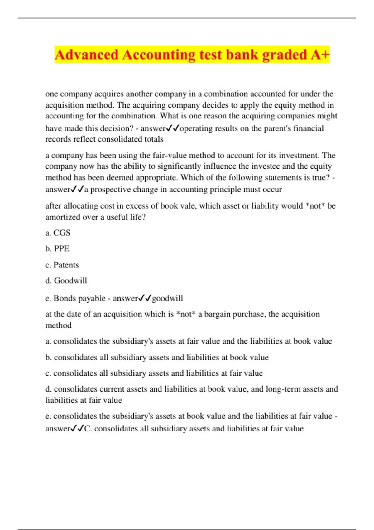 Advanced Accounting test bank graded A+ one company acquires another company in a combination accounted for under the acquisition method. The acquiring company decides to apply the equity method in accounting for the combination. What is one reason the acquiring companies might have made this decision? - answeroperating results on the parent's financial records reflect consolidated totals a company has been using the fair-value method to account for its investment. The company now has the ability to significantly influence the investee and the equity method has been deemed appropriate. Which of the following statements is true? - answera prospective change in accounting principle must occur after allocating cost in excess of book vale, which asset or liability would *not* be amortized over a useful life? a. CGS b. PPE c. Patents d. Goodwill e. Bonds payable - answergoodwill at the date of an acquisition which is *not* a bargain purchase, the acquisition method