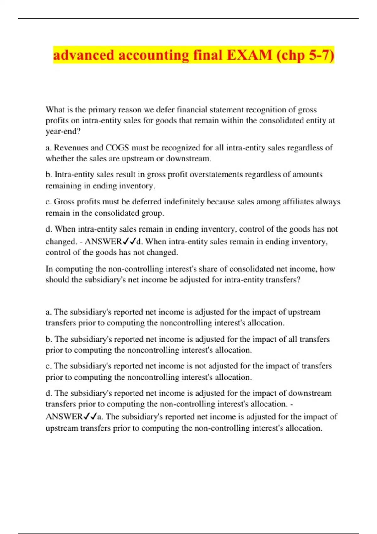 advanced accounting final EXAM (chp 5-7) What is the primary reason we defer financial statement recognition of gross profits on intra-entity sales for goods that remain within the consolidated entity at year-end? a. Revenues and COGS must be recognized for all intra-entity sales regardless of whether the sales are upstream or downstream. b. Intra-entity sales result in gross profit overstatements regardless of amounts remaining in ending inventory. c. Gross profits must be deferred indefinitely because sales among affiliates always remain in the consolidated group. d. When intra-entity sales remain in ending inventory, control of the goods has not changed. - ANSWERd. When intra-entity sales remain in ending inventory, control of the goods has not changed. In computing the non-controlling interest's share of consolidated net income, how should the subsidiary's net income be adjusted for intra-entity transfers? a. The subsidiary's reported net income is adjusted for the impact of upstream transfers prior to computing the noncontrolling interest's allocation. b. The subsidiary's reported net income is adjusted for the impact of all transfers prior to computing the noncontrolling interest's allocation. c. The subsidiary's reported net income is not adjusted for the impact of transfers prior to computing the noncontrolling interest's allocation. d. The subsidiary's reported net income is adjusted for the impact of downstream transfers prior to computing the non-controlling interest's allocation. - ANSWERa. The subsidiary's reported net income is adjusted for the impact of upstream transfers prior to computing the non-controlling interest's allocation.