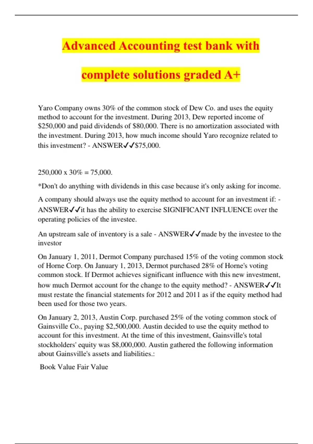 Advanced Accounting test bank with complete solutions graded A+ Yaro Company owns 30% of the common stock of Dew Co. and uses the equity method to account for the investment. During 2013, Dew reported income of $250,000 and paid dividends of $80,000. There is no amortization associated with the investment. During 2013, how much income should Yaro recognize related to this investment? - ANSWER$75,000. 250,000 x 30% = 75,000. *Don't do anything with dividends in this case because it's only asking for income. A company should always use the equity method to account for an investment if: - ANSWERit has the ability to exercise SIGNIFICANT INFLUENCE over the operating policies of the investee. An upstream sale of inventory is a sale - ANSWERmade by the investee to the investor On January 1, 2011, Dermot Company purchased 15% of the voting common stock of Horne Corp. On January 1, 2013, Dermot purchased 28% of Horne's voting common stock. If Dermot achieves significant influence with this new investment, how much Dermot account for the change to the equity method? - ANSWERIt must restate the financial statements for 2012 and 2011 as if the equity method had been used for those two years. On January 2, 2013, Austin Corp. purchased 25% of the voting common stock of Gainsville Co., paying $2,500,000. Austin decided to use the equity method to account for this investment. At the time of this investment, Gainsville's total stockholders' equity was $8,000,000. Austin gathered the following information about Gainsville's assets and liabilities.: Book Value Fair Value Buildings (10 yr life): $400,000 $500,000 Equipment (5 yr life): $1,000,000 $1,300,000 Franchises (8 yr life): $0 $400,000 For all other assets and liabilities, book value and fair value were equal. Any excess of cost over fair value was attributed to goodwill, which has not been impaired. What is the amount of goodwill associated with the investment? - ANSWER$300,000