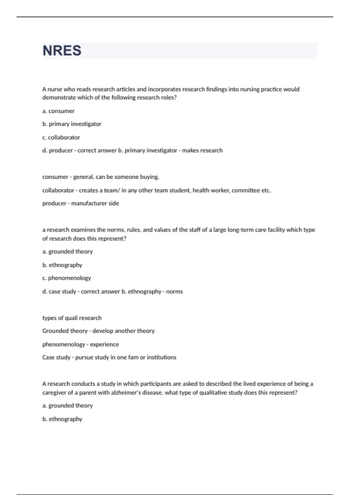 NRES, Question and answers 100% correct 2023/2024 A nurse who reads research articles and incorporates research findings into nursing practice would demonstrate which of the following research roles? a. consumer b. primary investigator c. collaborator d. producer - correct answer b. primary investigator - makes research consumer - general, can be someone buying. collaborator - creates a team/ in any other team student, health worker, committee etc. producer - manufacturer side a research examines the norms, rules, and values of the staff of a large long-term care facility which type of research does this represent? a. grounded theory