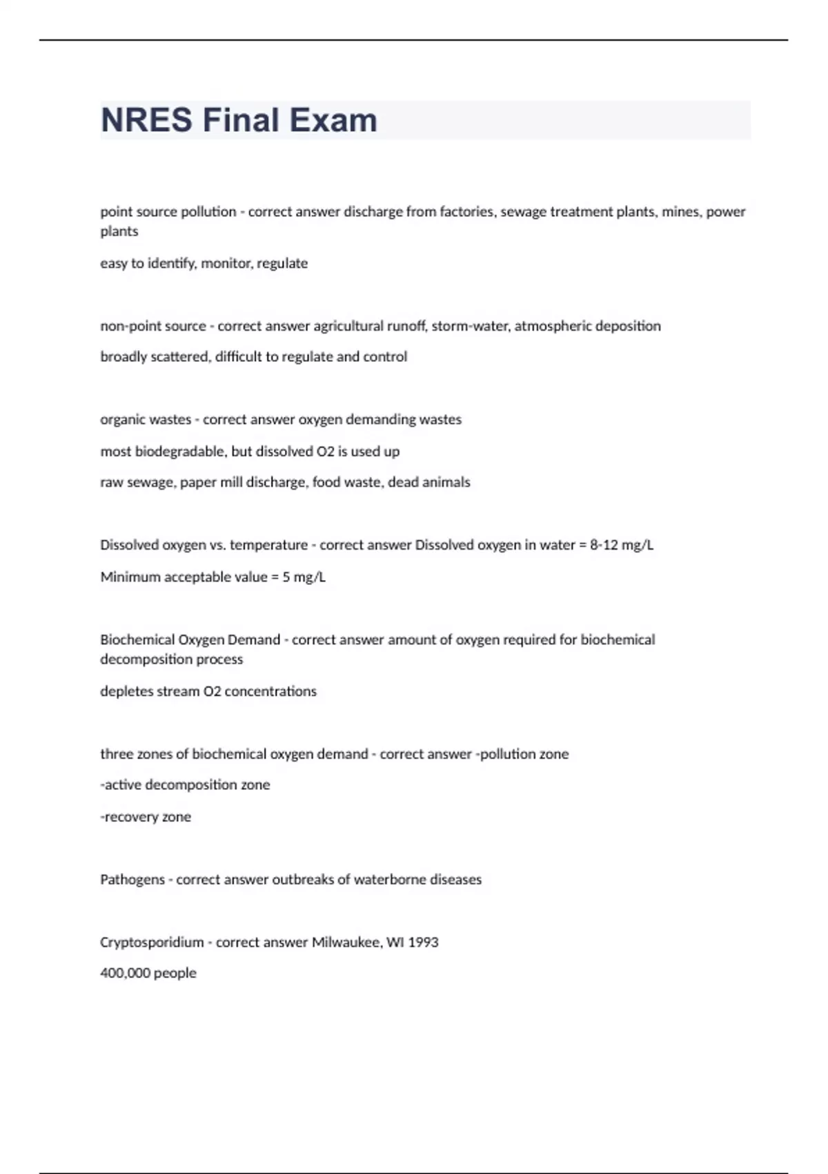 NRES Final Exam Question and answers 2023/2024 verified to passpoint source pollution - correct answer discharge from factories, sewage treatment plants, mines, power plants easy to identify, monitor, regulate non-point source - correct answer agricultural runoff, storm-water, atmospheric deposition broadly scattered, difficult to regulate and control organic wastes - correct answer oxygen demanding wastes most biodegradable, but dissolved O2 is used up raw sewage, paper mill discharge, food waste, dead animals
