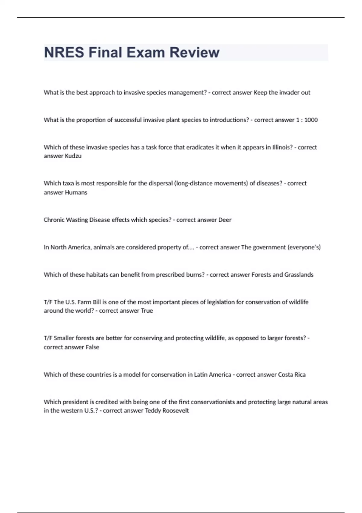 NRES Final Exam Review Question and answers 2023/2024 verified to pass What is the best approach to invasive species management? - correct answer Keep the invader out What is the proportion of successful invasive plant species to introductions? - correct answer 1 : 1000 Which of these invasive species has a task force that eradicates it when it appears in Illinois? - correct answer Kudzu Which taxa is most responsible for the dispersal (long-distance movements) of diseases? - correct