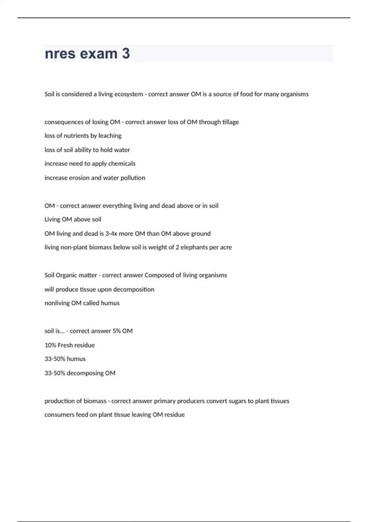 nres exam 3 Question and answers correctly solved 2023/2024Soil is considered a living ecosystem - correct answer OM is a source of food for many organisms consequences of losing OM - correct answer loss of OM through tillage loss of nutrients by leaching loss of soil ability to hold water increase need to apply chemicals increase erosion and water pollution OM - correct answer