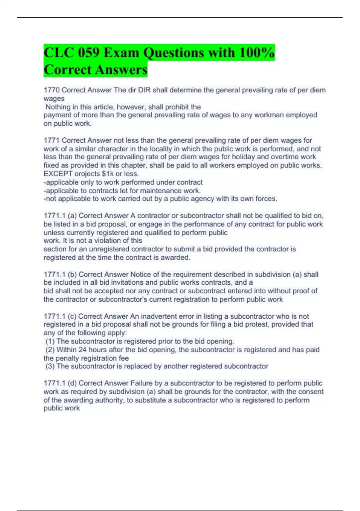 1770 Correct Answer The dir DIR shall determine the general prevailing rate of per diem wages Nothing in this article, however, shall prohibit the payment of more than the general prevailing rate of wages to any workman employed on public work. 1771 Correct Answer not less than the general prevailing rate of per diem wages for work of a similar character in the locality in which the public work is performed, and not less than the general prevailing rate of per diem wages for holiday and overtime work fixed as provided in this chapter, shall be paid to all workers employed on public works. EXCEPT orojects $1k or less. -applicable only to work performed under contract -applicable to contracts let for maintenance work. -not applicable to work carried out by a public agency with its own forces. 1771.1 (a) Correct Answer A contractor or subcontractor shall not be qualified to bid on, be listed in a bid proposal, or engage in the performance of any contract for public work unless currently registered and qualified to perform public work. It is not a violation of this section for an unregistered contractor to submit a bid provided the contractor is registered at the time the contract is awarded. 1771.1 (b) Correct Answer Notice of the requirement described in subdivision (a) shall be included in all bid invitations and public works contracts, and a bid shall not be accepted nor any contract or subcontract entered into without proof of the contractor or subcontractor's current registration to perform public work 1771.1 (c) Correct Answer An inadvertent error in listing a subcontractor who is not registered in a bid proposal shall not be grounds for filing a bid protest, provided that any of the following apply: (1) The subcontractor is registered prior to the bid opening. (2) Within 24 hours after the bid opening, the subcontractor is registered and has paid the penalty registration fee (3) The subcontractor is replaced by another registered subcontractor 1771.1 (d) Correct Answer Failure by a subcontractor to be registered to perform public work as required by subdivision (a) shall be grounds for the contractor, with the consent of the awarding authority, to substitute a subcontractor who is registered to perform public work
