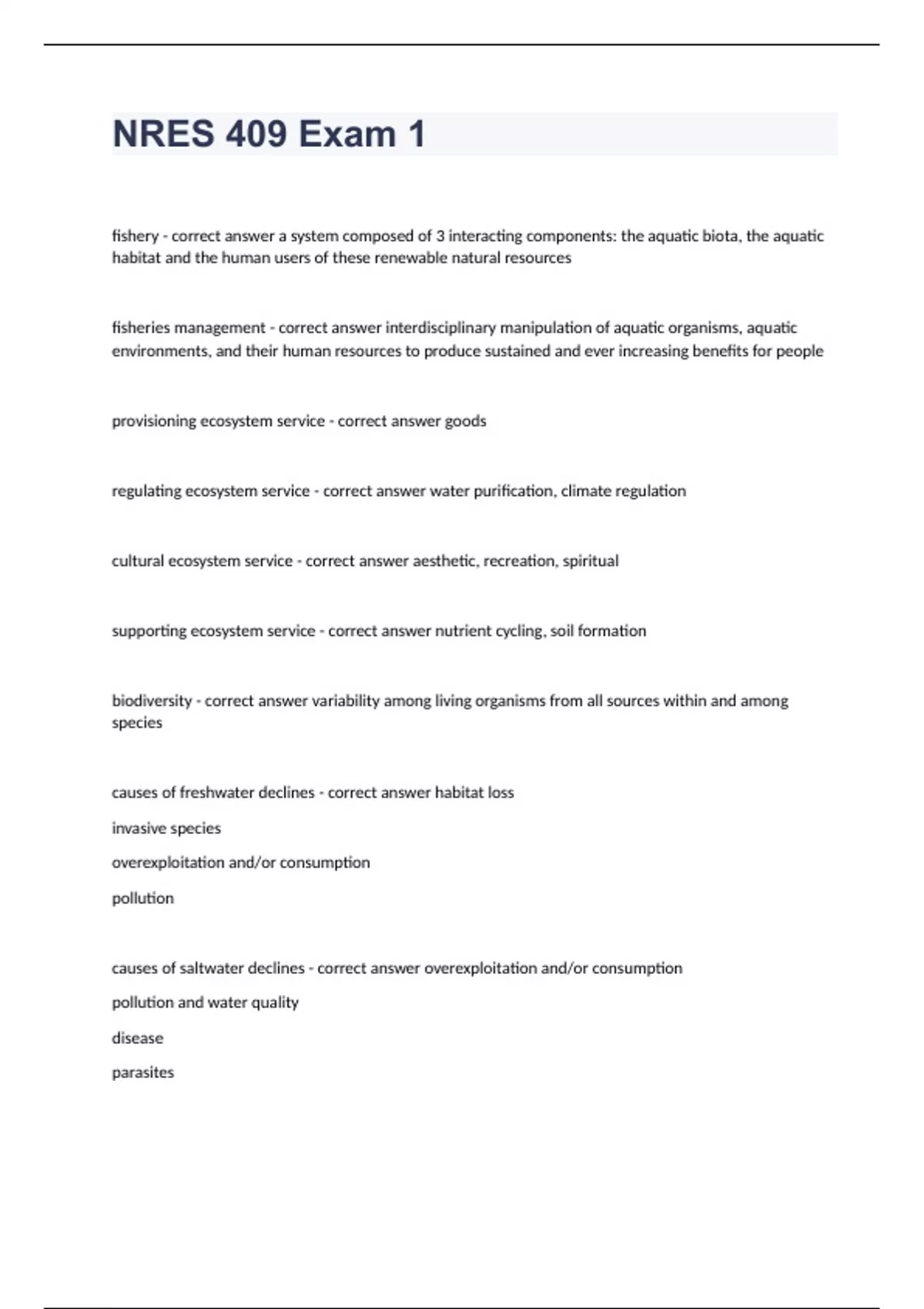 NRES 409 Exam 1 Question and answers 2023/2024 verified to passfishery - correct answer a system composed of 3 interacting components: the aquatic biota, the aquatic habitat and the human users of these renewable natural resources fisheries management - correct answer interdisciplinary manipulation of aquatic organisms, aquatic environments, and their human resources to produce sustained and ever increasing benefits for people provisioning ecosystem service - correct answer goods regulating ecosystem service - correct answer water purification, climate regulation cultural ecosystem service - c