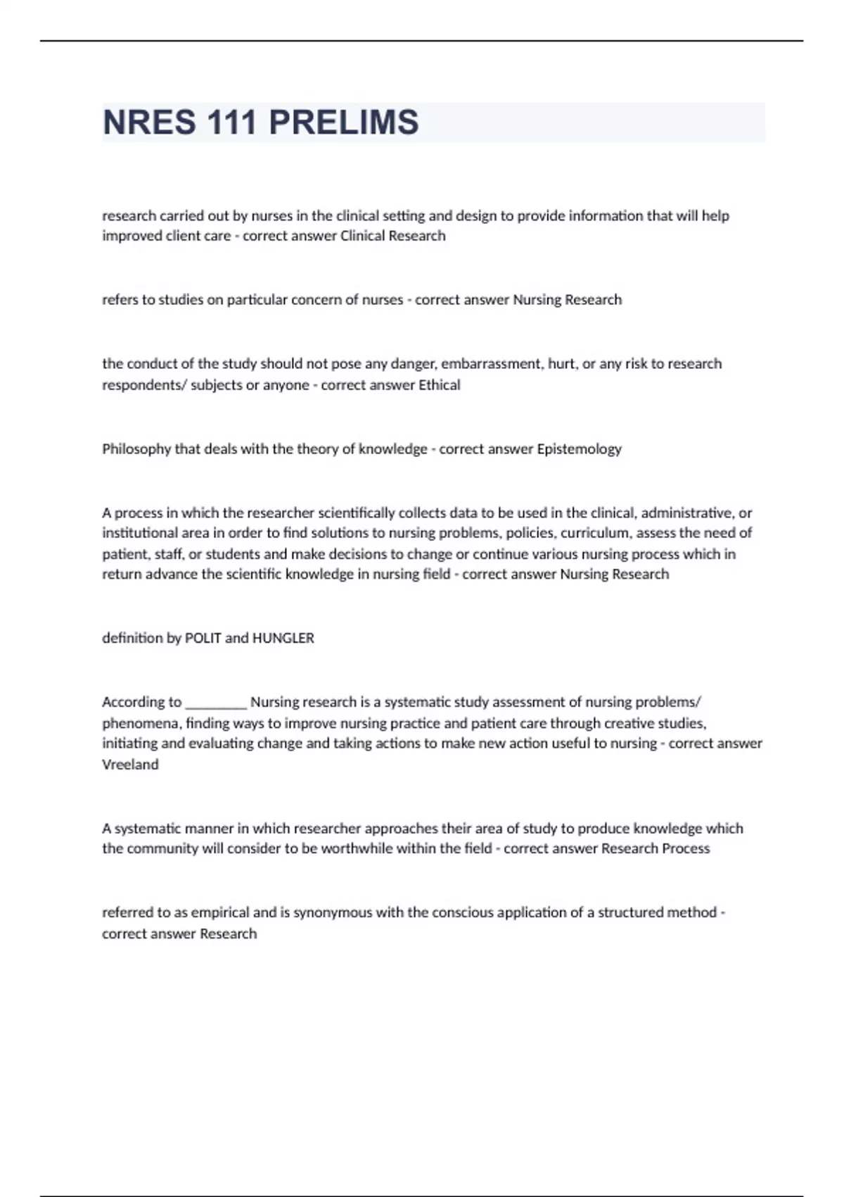 NRES 111 PRELIMS Question and answers already passed 2023/2024 research carried out by nurses in the clinical setting and design to provide information that will help improved client care - correct answer Clinical Research refers to studies on particular concern of nurses - correct answer Nursing Research the conduct of the study should not pose any danger, embarrassment, hurt, or any risk to research respondents/ subjects or anyone - correct answer Ethical Philosophy that deals with the theory of knowledge - correct answer Epistemology